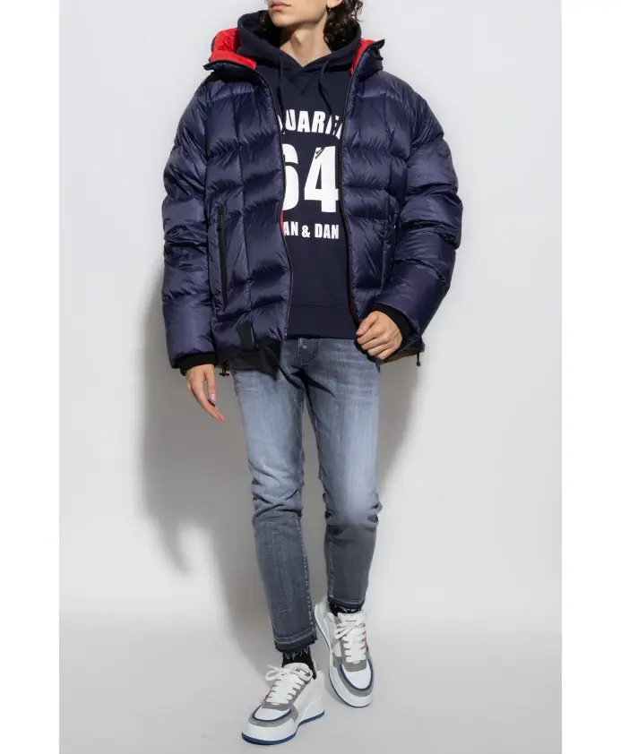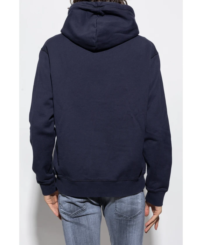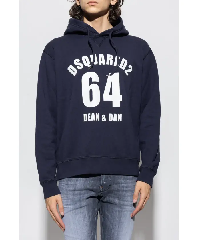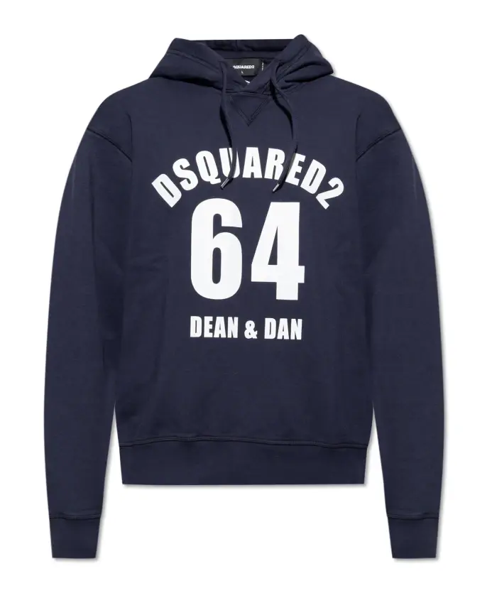 Темно-синяя толстовка с регулируемым капюшоном на шнурке от Dsquared2. Эта модель изготовлена из хлопка, имеет белый логотип спереди, длинные рукава, ребристые манжеты и нижний край.