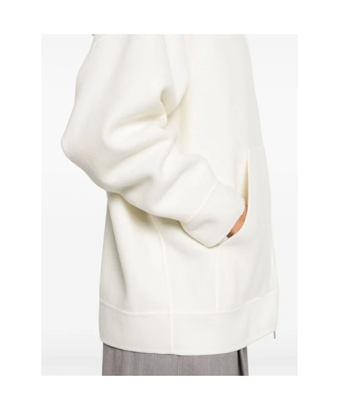 Дополните свой повседневный образ этой женской толстовкой Max Mara на молнии. Изготовленная из белой смеси натуральной шерсти, она имеет флисовую текстуру, застежку-молнию спереди, свободный капюшон, приспущенные плечи, длинные рукава, два боковых кармана-кенгуру и прямой низ.