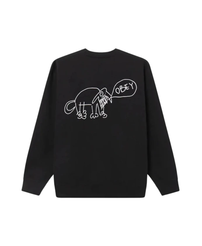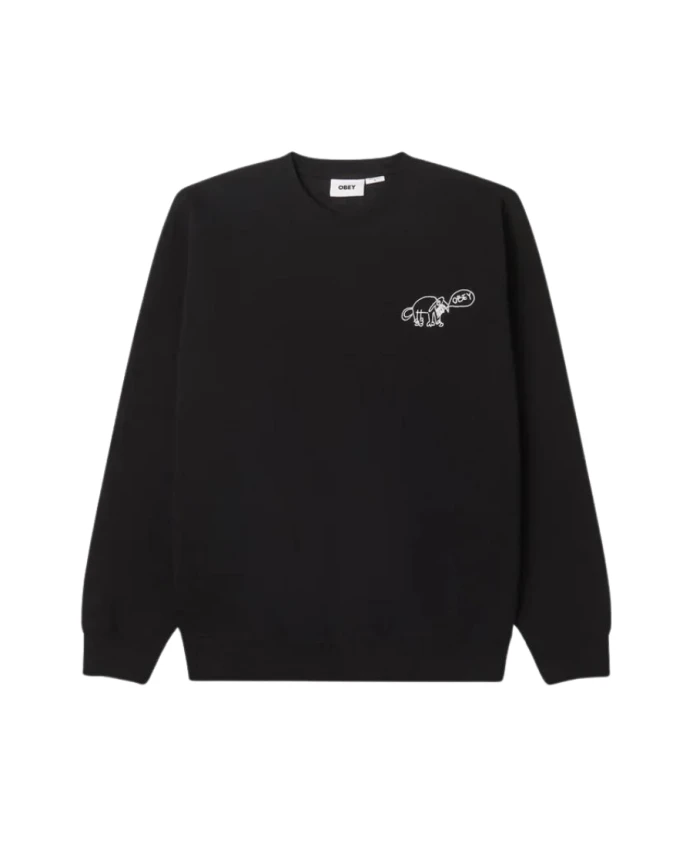 Мужская толстовка Obey с круглым вырезом, принтом на груди и контрастным крупным принтом на спине, длинными рукавами, обработанным вырезом горловины, манжетами и нижним краем, стандартным кроем, черного цвета, изготовлена из смесовой хлопковой ткани.