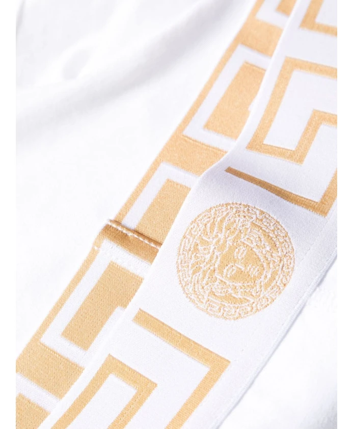 Обновите свою коллекцию нижнего белья этими белыми боксерскими шортами из эластичного хлопка от Versace. Благодаря эластичному поясу с культовым золотым греческим мотивом и золотому логотипу спереди, эти боксерские шорты легко сочетают в себе стиль и комфорт. Идеально подойдут для современного мужчины, ценящего качество и роскошь.