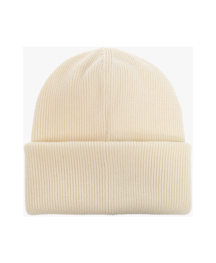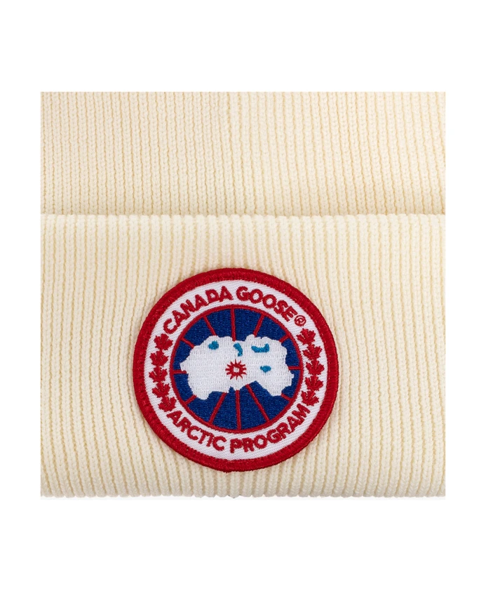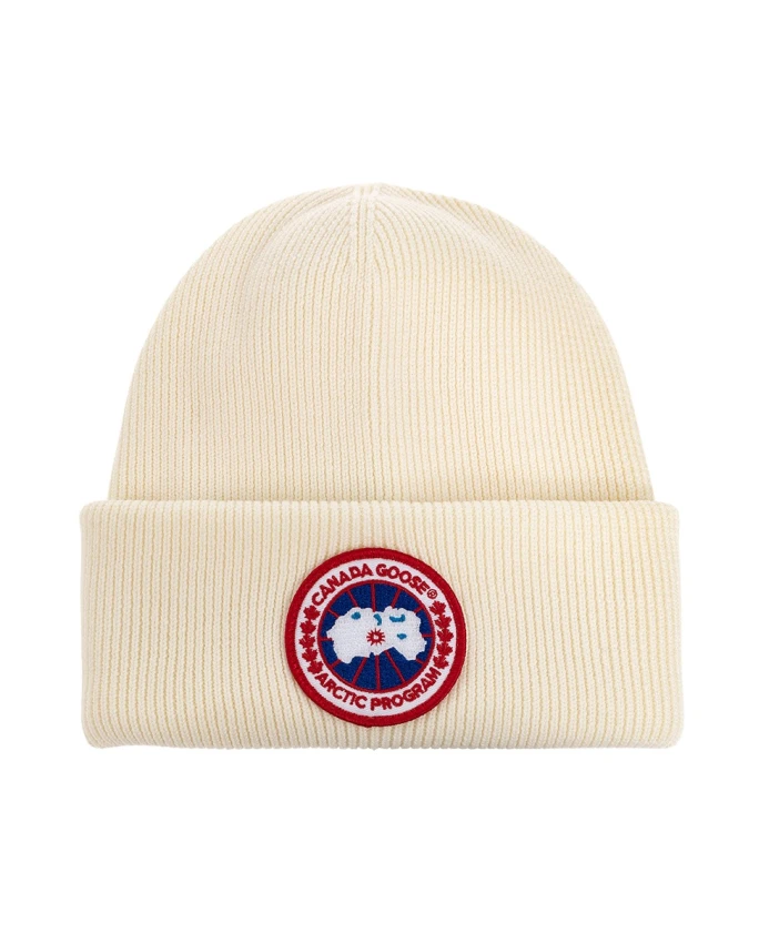 Ребристая шапка кремового цвета от Canada Goose. Изготовлена из шерсти, украшена нашивкой с логотипом синего, белого и красного цветов.