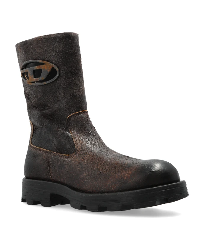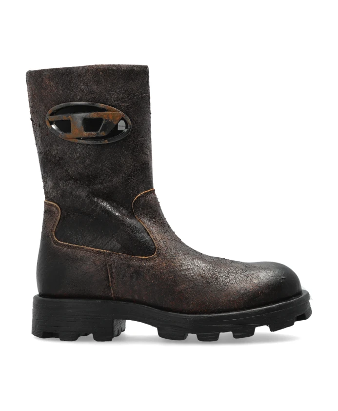 Кожаные ботинки Diesel D-HAMMER ANKLE BOOTS - это воплощение современной элегантности, создающее утонченный стиль с ноткой брутальности. Их вневременной коричневый цвет, подчеркнутый тонкими тональными переходами и эффектом состаривания, делает их идеальным дополнением к любому наряду, добавляя неповторимый шарм. Изготовленные из высококачественной натуральной кожи с характерной текстурой, эти ботинки гарантируют как долговечность, так и уникальный винтажный вид. Прочная, контурная подошва из высококачественной резины обеспечивает устойчивость, а слегка грубоватый дизайн до середины икры привлекает внимание своим утонченным силуэтом. Монохромная отделка подчеркнута металлическим и пластиковым дизайнерским логотипом, являющимся эксклюзивным товарным знаком Diesel. Видимая контрастная строчка и точные детали конструкции свидетельствуют о мастерстве исполнения. ПОЧЕМУ СТОИТ КУПИТЬ ЭТОТ ТОВАР? * Уникальная кожа ручной работы, отличающаяся исключительной износостойкостью * Исключительный дизайн с узнаваемым логотипом Diesel * Прочная, износостойкая подошва для комфорта * Превосходное внимание к деталям как в конструкции, так и в отделке * Идеальный выбор для тех, кто ценит сочетание традиций и современности. Высота подошвы: 3 см. Высота подошвы в самой высокой точке: 4 см.