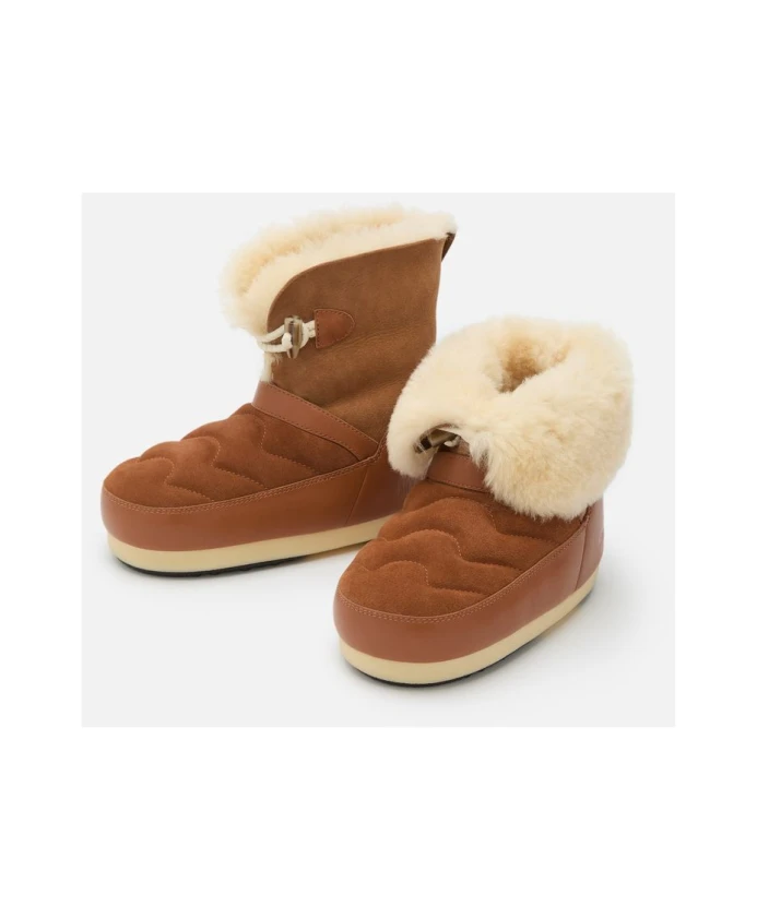 Бренд: Moon Boot Цвет: коричневый Материалы: верх: 51% замша из коровьей кожи, 49% овчина | подкладка: 100% овчина | подошва: 100% термопластичная резина. удаляйте грязь щеткой; пятна удаляйте мягкой влажной тканью с мягким моющим средством; не погружайте в воду; промокните насухо и дайте высохнуть на воздухе при комнатной температуре; храните в защитном мешочке.
