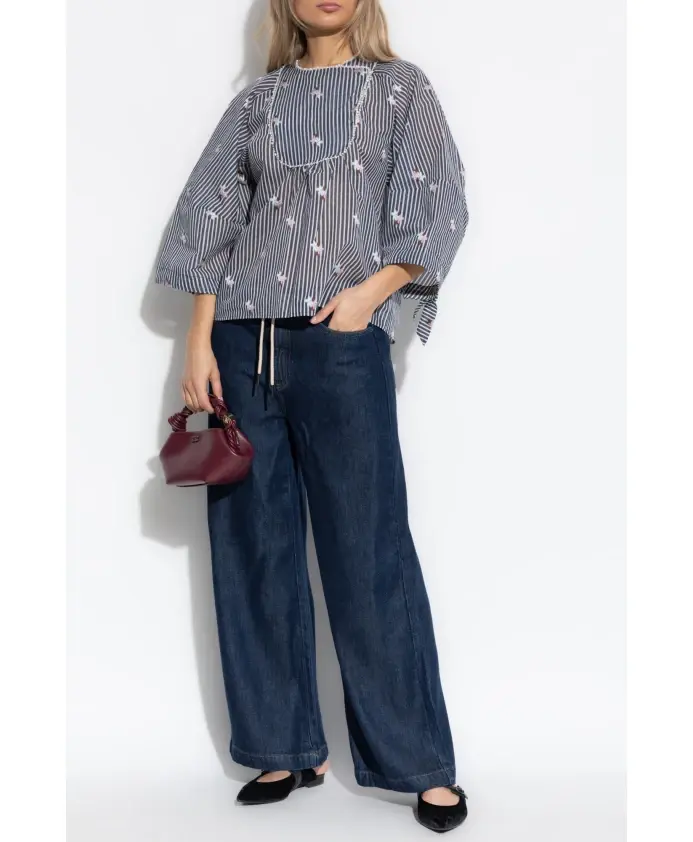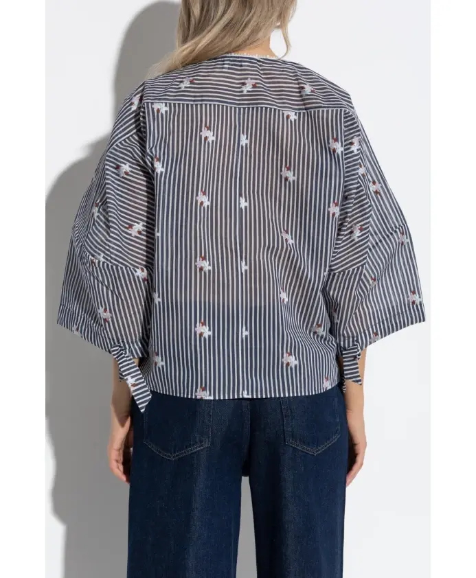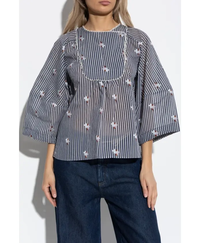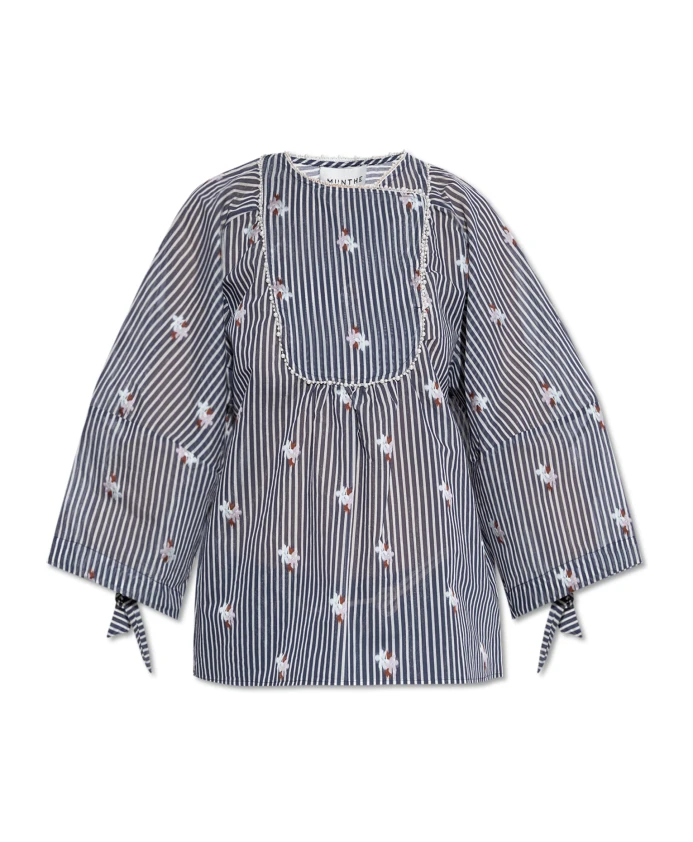 Топ PRISTINA от Munthe очаровывает своим изысканным силуэтом и утонченными деталями, воплощая в себе сущность датской элегантности. Эта модель впечатляет легкой, полупрозрачной тканью, которая мягко облегает силуэт и подчеркнута свободным, объемным кроем, тонко напоминающим букву А. Широкие рукава три четверти с завязками придают изделию легкость и художественный штрих. Гармоничную композицию завершают вертикальные темно-синие и белые полосы, украшенные вышитыми красочными цветочными мотивами. Кокетка и вырез горловины украшены декоративной окантовкой из крошечных бусин, подчеркивающей деликатность дизайна. Этот топ впечатляет своей легкостью, воздухопроницаемостью и уникальным характером - идеально подходит как для повседневной носки, так и для особых случаев. ПОЧЕМУ СТОИТ КУПИТЬ ЭТОТ ТОВАР? * Исключительный комфорт и воздухопроницаемость благодаря натуральной, нежной ткани. * Мастерское внимание к деталям: декоративная вышивка и тонкая отделка. * Универсальная, художественная эстетика - выражение индивидуального стиля. * Изделие от бренда с богатым датским наследием и приверженностью мастерству. Параметры модели: Рост: 177 см, Обхват груди: 83 см, Обхват талии: 61 см, Обхват бедер: 89 см. Модель носит размер 36.