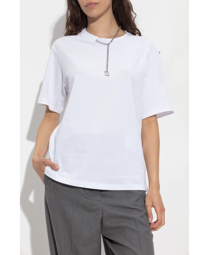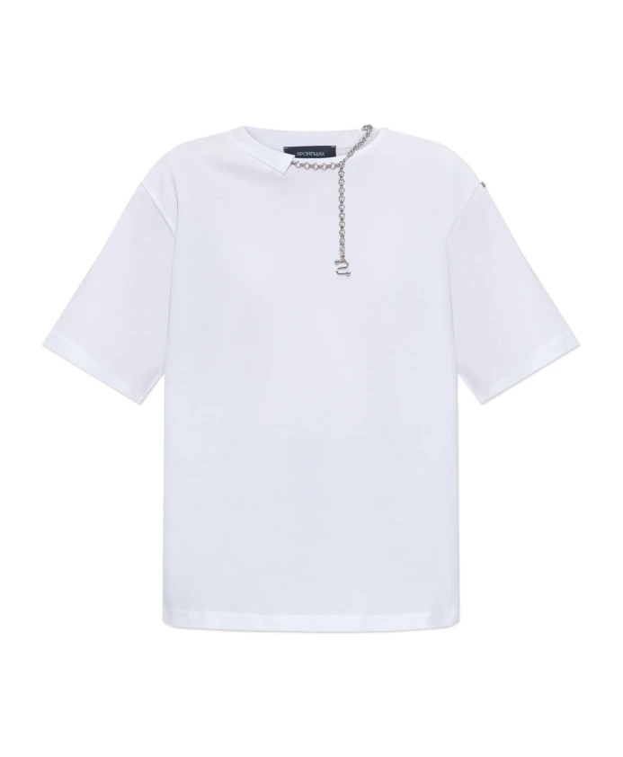 Футболка OBLATO от SPORTMAX - это воплощение современной элегантности, уходящей корнями в итальянские традиции пошива. Простой, слегка свободный крой со спущенной линией плеч и расслабленными рукавами обеспечивает свободу движений и сдержанную непринужденность. Изготовленная из гладкого, высококачественного белого хлопка, она идеально подойдет для ценителей повседневной роскоши. Монохромный характер этой модели подчеркнут исключительной деталью - декоративной серебряной цепочкой на вырезе горловины. Продетая через небольшой разрез, массивная цепочка свисает с передней части футболки, образуя художественный, витой элемент - фирменный мотив коллекции. Отсутствие видимых надписей или логотипов подчеркивает изысканную сдержанность изделия. ПОЧЕМУ ЭТОТ ТОВАР СТОИТ КУПИТЬ? * Исключительное сочетание итальянских традиций пошива и современного подхода к форме. * Высококачественный хлопок обеспечивает комфорт и долговечность. * Уникальная серебряная цепочка на вырезе горловины - эффектная деталь для ценителей оригинальности. * Минималистичный дизайн позволяет легко создавать различные стилистические образы. Параметры модели: Рост: 176 см, Обхват груди: 85 см, Обхват талии: 60 см, Обхват бедер: 89 см. Модель носит размер: S