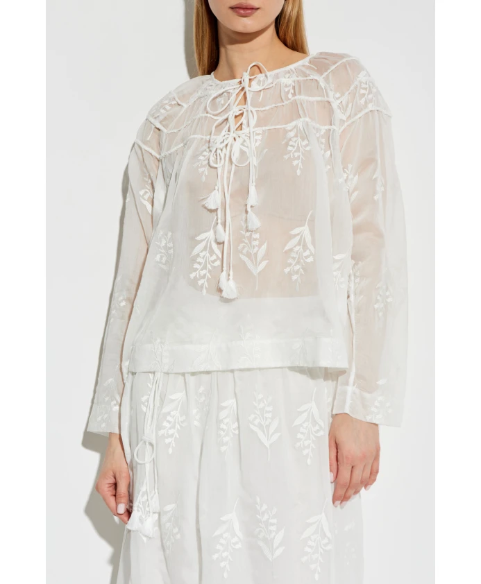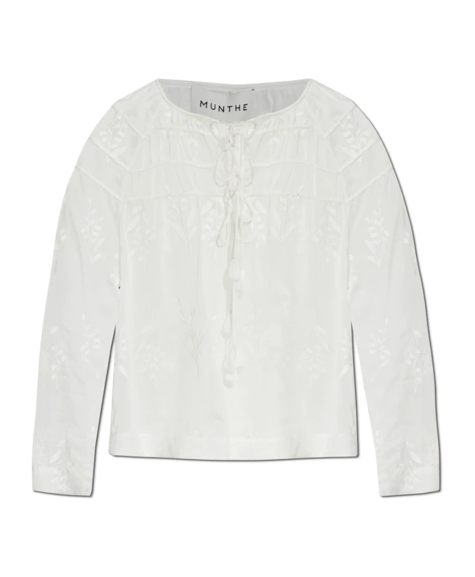 Представляем блузку с завязками от известного бренда MUNTHE, воплощающую шик и утонченную элегантность. Изготовленная из полупрозрачной, легкой ткани, блузка очаровывает своим белым цветом, подчеркивающим ее изысканность. Вся поверхность украшена тонкой вышивкой с растительными мотивами, добавляющей уникальности и художественной выразительности. Простой, свободный крой с длинными рукавами в сочетании с завязками на вырезе горловины, украшенными декоративными кисточками, создает композицию, идеально подходящую для формальных и полуформальных случаев. Внимание к деталям дополнительно подчеркивается ненавязчиво расположенным логотипом бренда на внутренней стороне выреза горловины. ПОЧЕМУ СТОИТ КУПИТЬ ЭТОТ ТОВАР? * Высококачественные материалы: сочетание лиоцелла и полиамида обеспечивает комфорт и долговечность. * Уникальная вышивка с растительными мотивами добавляет художественного шарма. * Элегантный крой с декоративными завязками, идеально подходящий для различных случаев. * Бренд MUNTHE гарантирует качество и вневременной стиль. Параметры модели: Рост: 176 см, Обхват груди: 85 см, Обхват талии: 60 см, Обхват бедер: 89 см. Модель носит размер: 36.