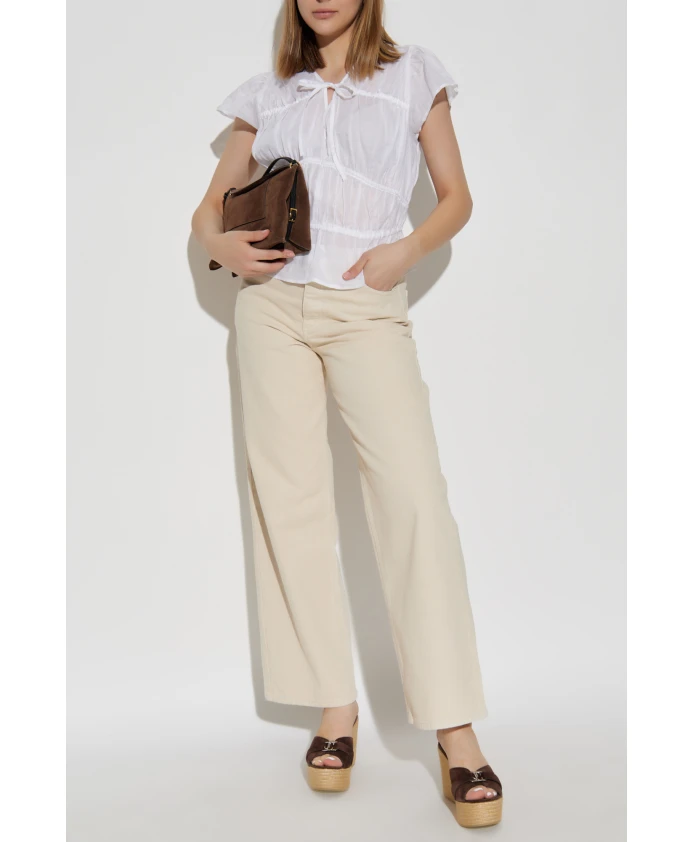 Топ с V-образным вырезом от Rag & Bone - это идеальное сочетание легкости, утонченности и изысканного минимализма. Выполненный в белоснежном цвете, этот дизайн очаровывает своим исключительным силуэтом: слегка расклешенный подол гармонично сочетается с короткими рукавами-бабочками, а эластичная драпировка на талии элегантно подчеркивает женскую фигуру. Ткань из чистой рами отличается полупрозрачной, тонко сотканной текстурой и легким эффектом мятой поверхности, обеспечивая воздухопроницаемость и уникальные ощущения. Центральным акцентом изделия является изящный бант вдоль выреза горловины, ненавязчиво дополняющий общую композицию. Дополнительная, слегка собранная драпировка, тщательно выполненная, свидетельствует о мастерстве исполнения. ПОЧЕМУ СТОИТ КУПИТЬ ЭТОТ ТОВАР? * Эксклюзивная ткань рами гарантирует максимальный комфорт и изысканность * Уникальный крой, подчеркивающий лучшие черты фигуры * Универсальный, вневременной цвет * Тщательная работа и уникальные украшения * Фирменный знак известного бренда Rag & Bone Параметры модели Рост: 177 см Обхват груди: 83 см Обхват талии: 61 см Обхват бедер: 89 см Модель носит размер: S