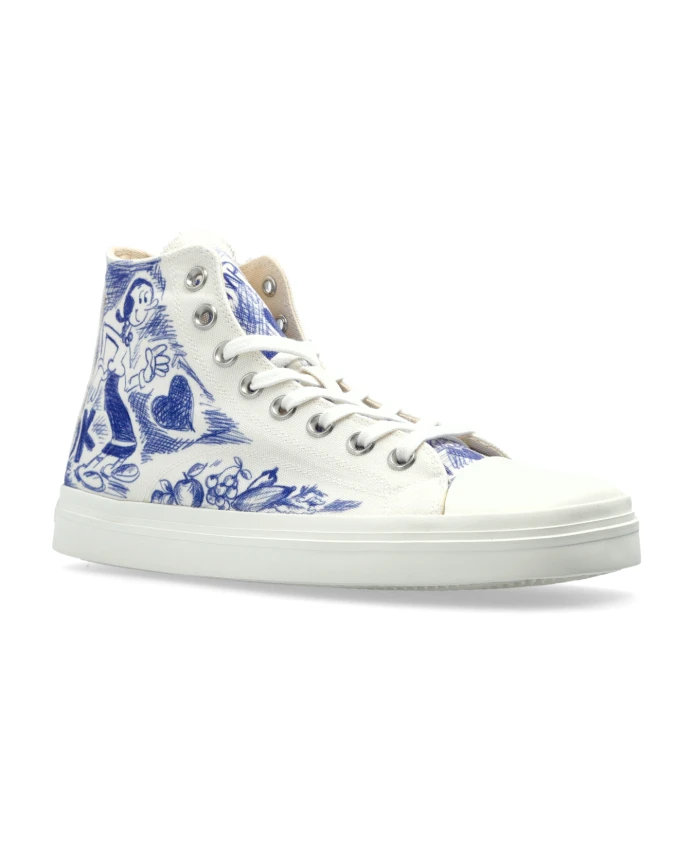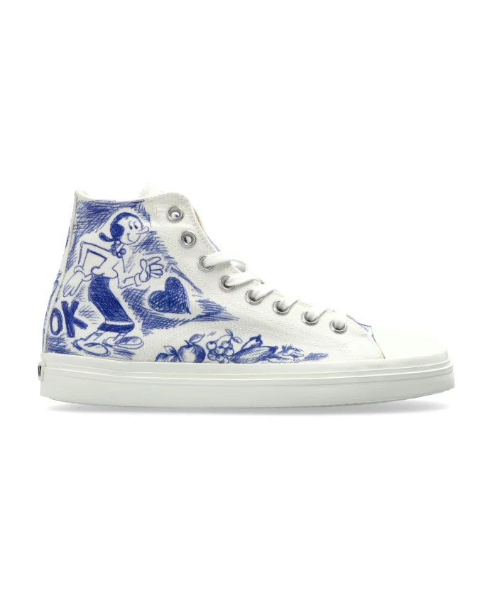 Элегантные и необычные белые высокие кроссовки от известного бренда Moschino впечатляют своим художественным оформлением. Их уникальный дизайн, включающий синие эскизы и рисунки сердец, цветов и вымышленных персонажей, придает им неповторимый, модный характер. Классическая форма кроссовок с приподнятым профилем обеспечивает дополнительную поддержку, что делает их идеальным выбором как для повседневной носки, так и для особых случаев. Текстильный верх гарантирует комфорт и воздухопроницаемость, а резиновая подошва обеспечивает отличное сцепление. Металлические люверсы на шнурках подчеркивают классический вид, а ненавязчивый логотип бренда добавляет нотку роскоши. ПОЧЕМУ ВЫБРАТЬ ЭТОТ ТОВАР? * УНИКАЛЬНЫЙ ДИЗАЙН - Художественные узоры придают обуви неповторимый стиль. * КОМФОРТ И ФУНКЦИОНАЛЬНОСТЬ - Комфорт в ношении благодаря текстильному верху и резиновой подошве. * ИЗВЕСТНЫЙ БРЕНД - Moschino олицетворяет роскошь и свежесть в мире моды. * УНИВЕРСАЛЬНОСТЬ - Идеально подходят для повседневной носки и особых случаев. Высота подошвы: 2,5 см. Высота подошвы в самой высокой точке: 3 см.