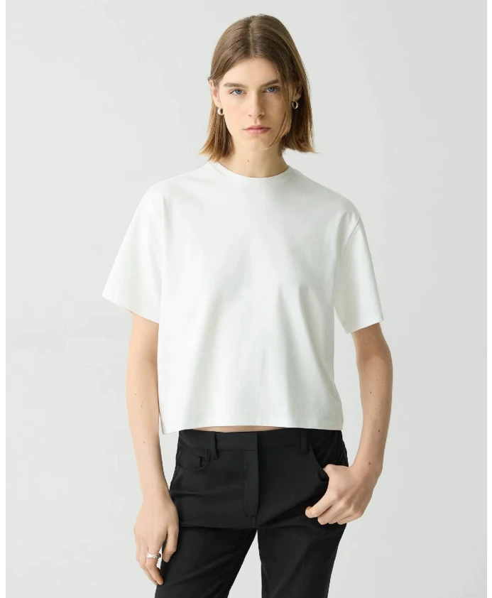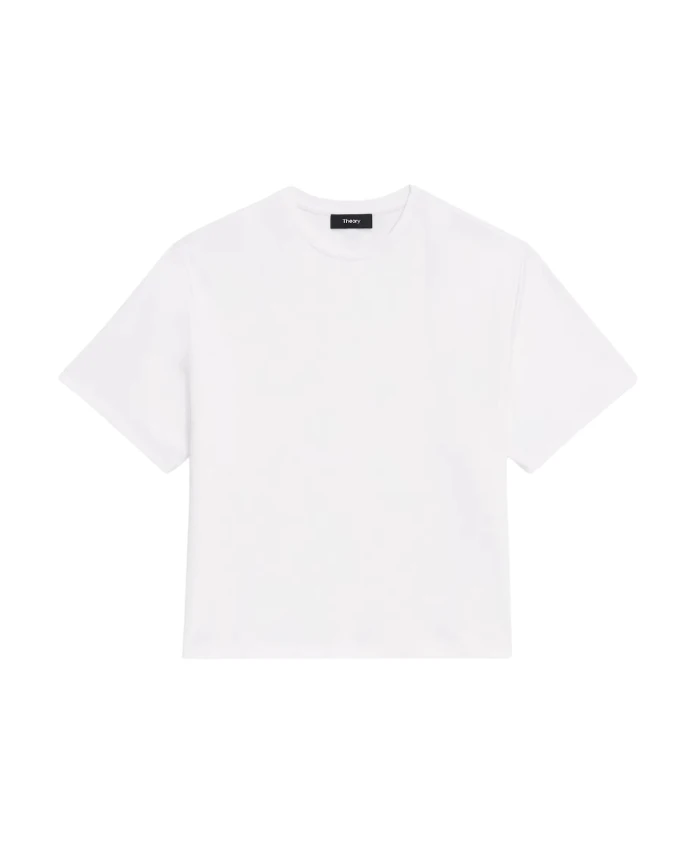 Футболка Theory Boxy Tee - это свободная укороченная футболка из хлопкового трикотажа, созданная для повседневного многослойного образа. Она имеет легкий блеск и естественную эластичность для комфортного ощущения. Ключевые характеристики: Белый | Хлопок | Естественная эластичность | Длина до бедра | Укороченный силуэт | Круглый вырез | Короткие рукава | Изящная отделка рукавов | Укороченный низ | Размеры и посадка: P - Длина: 50,8 см; Грудь: 94 см; Рукав: 40,1 см | S - Длина: 52,3 см; Грудь: 97,8 см; Рукав: 41,4 см | M - Длина: 54,1 см; Грудь: 102,9 см; Рукав: 42,7 см | L - Длина: 56,9 см; Грудь: 108 см; Рукав: 43,9 см | XL - Длина: 58,7 см; Грудь: 115,6 см; Рукав: 45,5 см | Соответствует размеру | Свободный крой | Длина до бедра | Состав и уход: 100% хлопок | Машинная стирка в холодной воде, деликатный режим, с вещами схожих цветов; стирать наизнанку. Не отбеливать. Сушить в сушилке при низкой температуре. При необходимости прогладить утюгом при низкой температуре. Не подвергать химчистке.