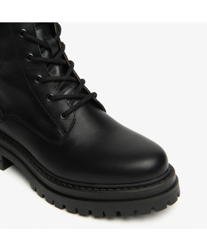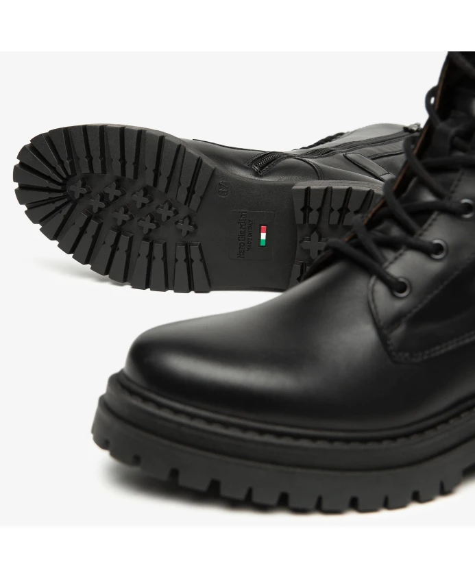 Ботинки Nero Giardini Combat Boot - итальянские ботинки на шнуровке, сочетающие в себе верх из кожи и технической ткани с стелькой из пеноматериала DryGo! с эффектом памяти для надежного комфорта с утра до вечера. Ключевые особенности: Черный цвет | Кожа и техническая ткань | Полиуретановая стелька DryGo! - быстросохнущая и влагоотводящая | Амортизирующая стелька из пеноматериала с эффектом памяти | Нескользящая резиновая подошва | Шнуровка с боковой молнией | Съемная стелька | Блочный каблук | Ботинки до щиколотки | Круглый носок | Усиленная прострочка | Тиснение итальянского флага на подошве | Размеры и посадка: Стандартная посадка | Состав и уход: Кожа (верх) | Техническая ткань (верх) | Кожа (подкладка) | Резиновая подошва | Съемная полиуретановая стелька DryGo! | Чистить влажной тканью; избегать растворителей. Дать высохнуть естественным образом без прямого нагрева. Обрабатывать кожу подходящими средствами по уходу за кожей. После использования вынимать стельку для проветривания.