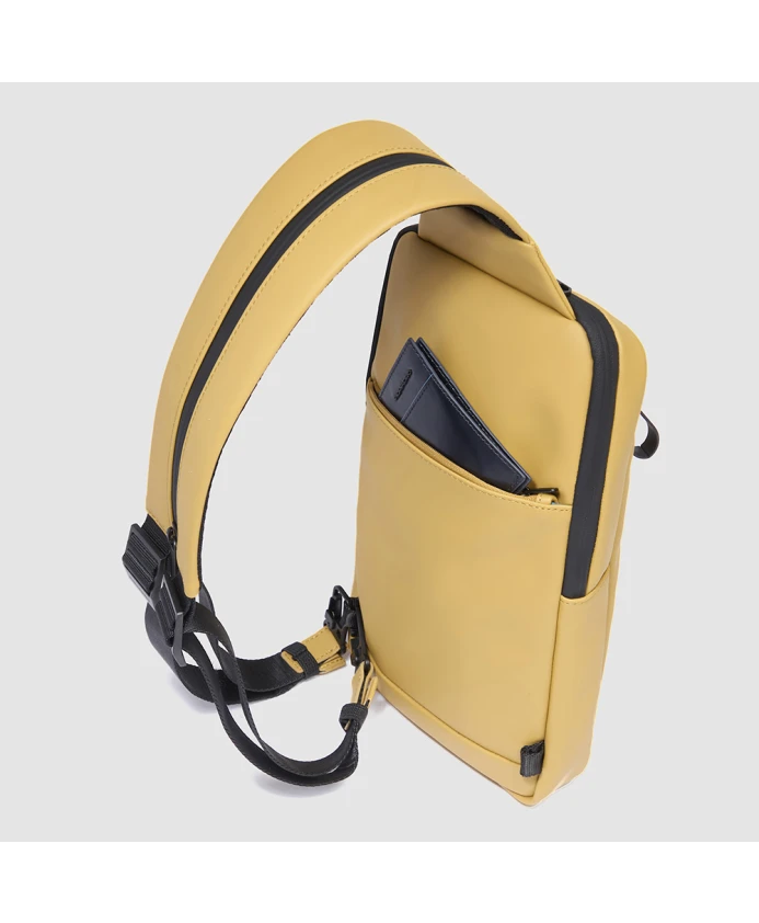 Сумка-слинг Piquadro Mono для iPad Mini сочетает в себе компактный, трансформируемый силуэт с защитой от RFID-сканирования и специальным отделением для смарт-трекера Piquadro. Разработанная для повседневного использования в городе, она имеет водоотталкивающую прорезиненную ткань и надежное мягкое отделение для iPad mini. Ключевые характеристики: Желтый | Джелло | Ткань | Водоотталкивающая | Защита от RFID | Отделение для смарт-трекера Piquadro | Трансформируется в рюкзак | Можно носить на правом или левом плече | Компактный силуэт слинга | Прорезиненное покрытие | Мягкое отделение для iPad mini | Размеры и посадка: 18,0 x 32,0 x 7,0 см | Объем: 2,50 л | Вес: 470 г | Состав и уход: Ткань | 100% полиэстер (подкладка) Чистите ткань влажной губкой с мягким мылом; избегайте агрессивных химикатов или растворителей. Не гладить и не подвергать химчистке. Для кожаных деталей используйте нейтральный кондиционер для кожи на восковой основе; избегайте погружения в воду и прямого воздействия тепла.
