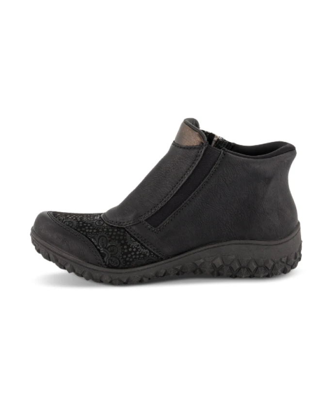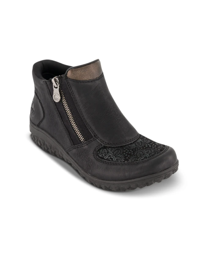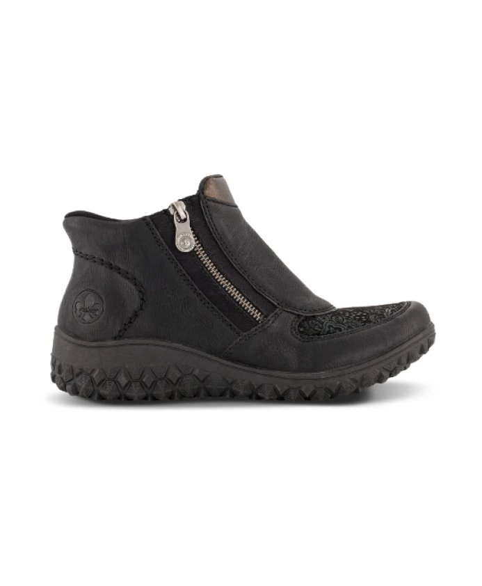 Ботильоны Rieker Bronia сочетают в себе комфорт Ready2GO для легкого надевания без помощи рук и технологию Antistress Comfort от бренда, обеспечивающую легкую амортизацию и удобство надевания/снятия для повседневной носки в холодную погоду. Ключевые особенности: Черный | Искусственная кожа | Легкие | Гибкие | Хорошее сцепление | Не водоотталкивающие | Ready2GO для легкого надевания без помощи рук (задник, сохраняющий форму) | Съемная мягкая стелька | Легкая и гибкая подошва | Боковая молния для удобного надевания | Флисовая подкладка | Танкетка 38 мм | Легкая подошва TR со стабилизирующим протектором | Размеры и посадка: Высота каблука: 38 мм | Высота голенища: 8 см | Очень широкие - комфортная ширина H | Конструкция Ready2GO для легкого надевания и снимания (задник, сохраняющий форму) | Состав и уход: Верх: Искусственная кожа | Подкладка: Флис / Бархат (текстиль) | Стелька: Съемная, мягкая стелька (текстиль) | Подошва: Легкая, из термоволокна (синтетический материал)