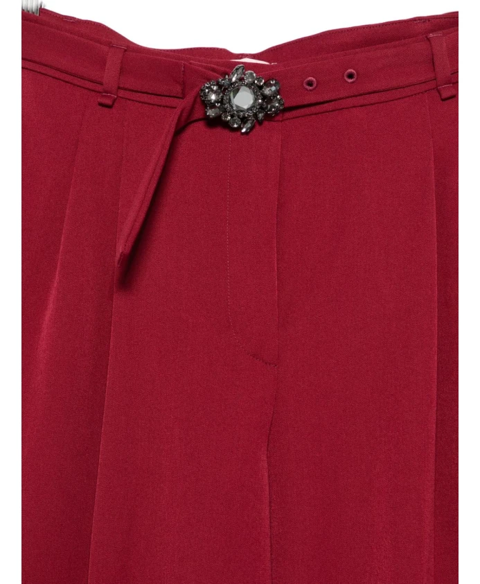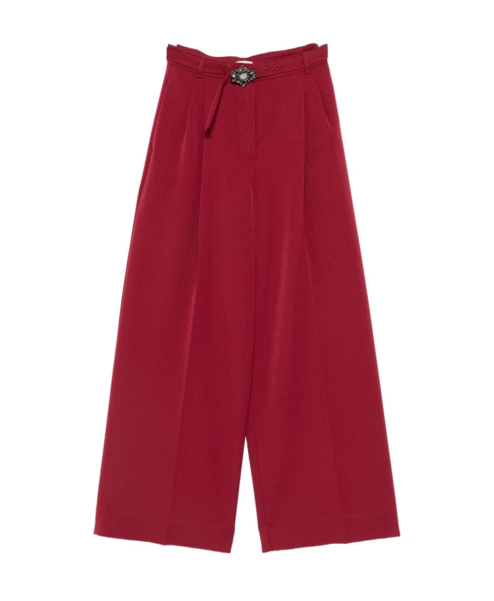 Брюки-палаццо Liu Jo с поясом сочетают в себе широкий силуэт палаццо и пояс с декоративной пряжкой, создавая элегантный и универсальный образ. Эластичная ткань обеспечивает комфорт и красивую драпировку, будь то офисная одежда или нарядная одежда. Ключевые особенности: Красный | Бордовый | Полиэстер | Эластичная ткань | Боковые карманы | Задние прорезные карманы | Пояс с декоративной пряжкой | Силуэт палаццо | Передние вытачки | Складка | Размеры и посадка: Широкие штанины | Высокая талия | Ткань и уход: Верх: 78% полиэстер, 18% вискоза, 4% эластан | Подкладка: 100% полиэстер | Машинная стирка в холодной воде (макс. 30°C), деликатный режим; стирать наизнанку; защищать декоративные элементы во время стирки. Не отбеливать. Не сушить в сушильной машине. Возможна химчистка (перхлорэтилен, деликатный режим). Гладить при максимальной температуре 110°C; не гладить по декоративным элементам.