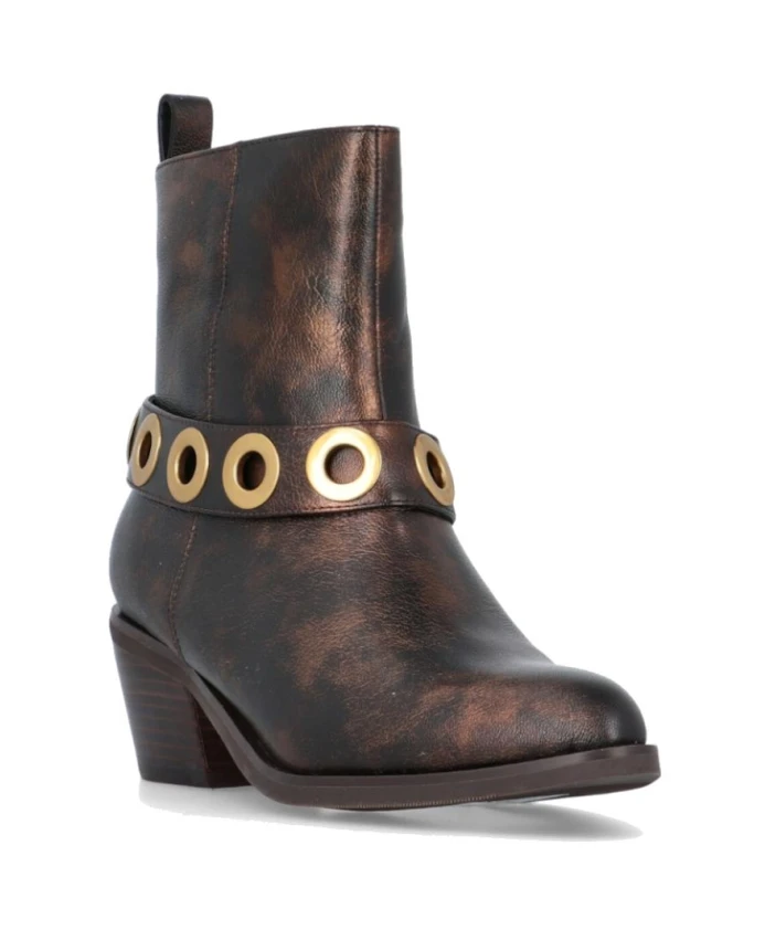 Ботильоны Bruno Premi из кожи цвета состаренной меди, сочетающие ковбойский каблук с двойной амортизирующей стелькой из вязкоэластичного материала для комфорта в течение всего дня. Практичные детали - боковая застежка-молния, петля сзади для удобства надевания и ремешок на щиколотке с металлическими люверсами - делают их удобными в ношении и создании стильных образов. Ключевые особенности: Коричневый | Медный | Кожа | Двойная амортизирующая стелька из вязкоэластичного материала для длительного комфорта | Боковая застежка-молния | Петля сзади для удобства надевания | Деталь на ремешке на щиколотке | Кожа цвета состаренной меди | Ковбойский каблук | Высота до щиколотки | Ремешок на щиколотке с металлическими люверсами | Размеры и посадка: Высота каблука: 5,5 см | Материал и уход: Верх: Кожа | Подкладка: Кожа, микрофибра | Стелька: Амортизирующая стелька из вязкоэластичного материала