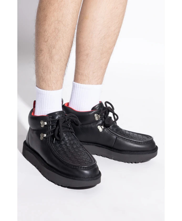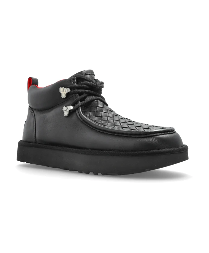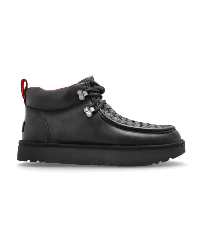 Сапоги UGG Woven Boot, созданные в сотрудничестве с AMBUSH, переосмысливают классические ботинки-чукка, превращая их в изысканные повседневные ботинки с эффектной плетеной кожаной передней частью и мягкой кожаной подкладкой внутри. Ключевые особенности: Черный цвет | Нубук | Повышенная водостойкость | Прочная и стабильная конструкция | Система шнуровки с тремя металлическими крючками | Задняя петля для удобного надевания и снимания | Массивная резиновая/EVA подошва для устойчивости | Плетеная кожаная деталь на мыске | Силуэт чукка/миндалевидный носок | Контрастная красная подкладка | Размеры и посадка: Высота подошвы в самой высокой точке: 3,5 см | Соответствует размеру. | Состав и уход: Верх: Нубук | Подкладка: Натуральная кожа | Подошва: Синтетическая (EVA/резина). Сапоги UGG поначалу сидят плотно, но со временем подкладка растягивается. Рекомендуем выбирать свой обычный размер.