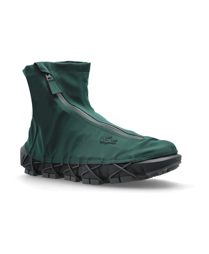 Кроссовки Lacoste Gaitor Runway сочетают в себе силуэт высоких кед в стиле «для активного отдыха» со съемными нейлоновыми накладками и массивной текстурированной подошвой, создавая смелый современный образ. Ключевые особенности: Темно-зеленый цвет | Синтетика и текстиль | Прочная резиновая/EVA подошва | Защитная система рукавов | Съемные нейлоновые накладки с технической молнией и эластичной застежкой | Накладки, которые можно вставить в выступающую секцию на подошве | Текстильная подкладка | Высокий силуэт | Массивная текстурированная резиновая подошва | Футуристический профиль | TPU-имитация крокодила на центральной панели | Размеры и посадка: Высота подошвы: 5,5 см | Вес одной обуви: около 425 г Состав и уход: Верх: 97% полиэстер, 3% эластан | Подкладка: 75% полиэстер, 24% полиуретан, 1% эластан | Стелька: 100% текстиль (100% полиэстер) | Подошва: 50% резина, 50% EVA