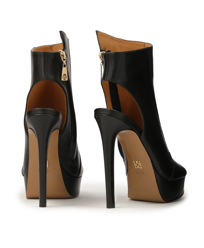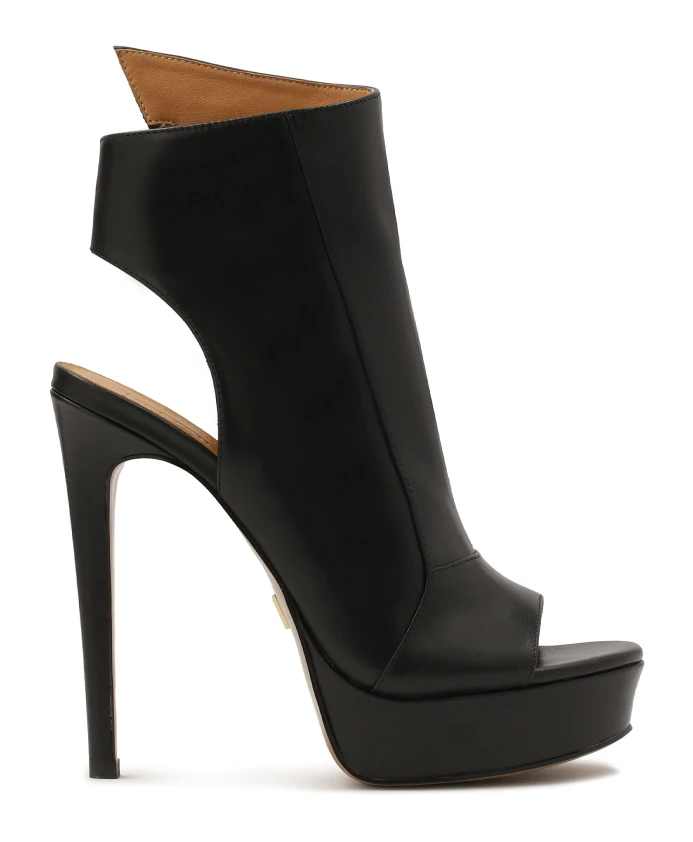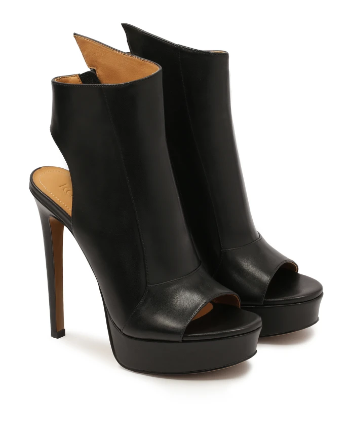 Эти изысканные ботильоны с открытым носком из натуральной черной кожи - идеальное сочетание элегантности и чувственного стиля. Открытый носок и каблук придают ботильонам легкость и современность, а также едва уловимую хищную нотку. Ботильоны оснащены молнией для удобства надевания и снимания, а золотые детали, такие как металлическая молния и другие акценты, подчеркивают роскошный характер этой модели и прекрасно контрастируют с черной кожей. Ботильоны имеют высокий, тонкий каблук, который визуально удлиняет ноги, а дополнительная платформа обеспечивает устойчивость и комфорт, несмотря на впечатляющую высоту каблука. Мягкая подкладка из полуанилиновой овчины, известная своими превосходными влагопоглощающими свойствами, гарантирует высокий уровень комфорта. Тунисская кожаная подошва обеспечивает долговечность, прочность и эстетичный внешний вид обуви.