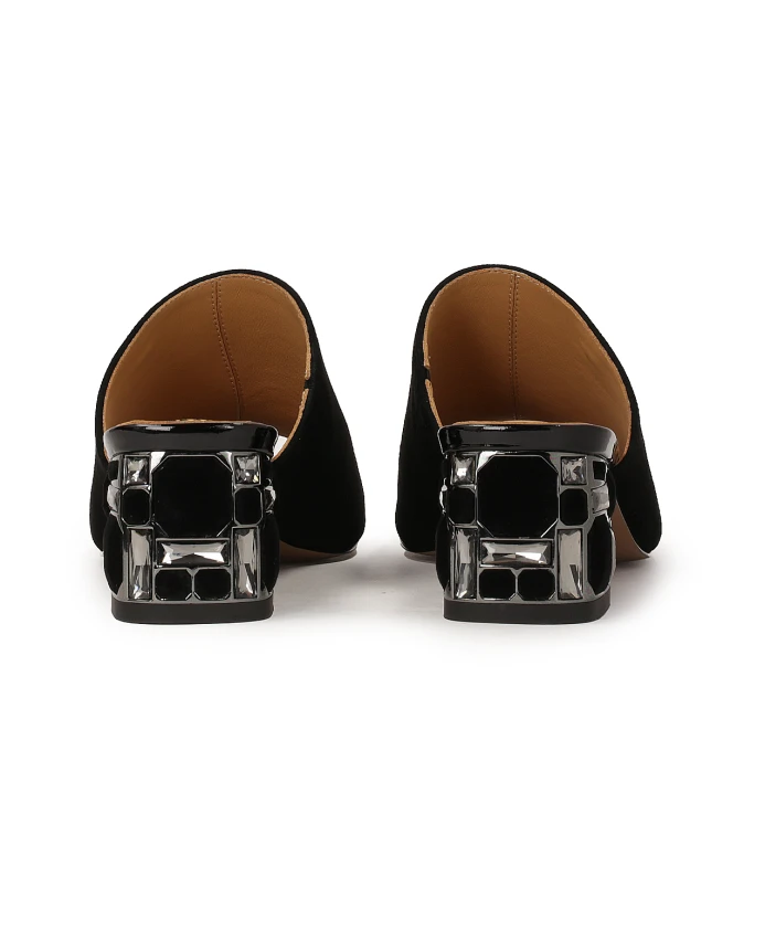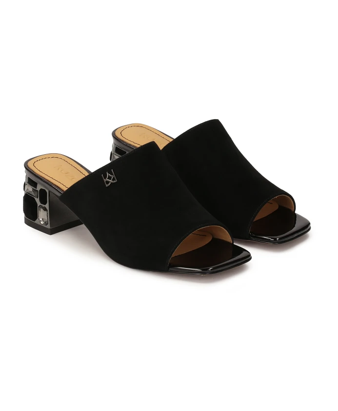 Черные мюли из высококачественной замши - воплощение элегантности и неповторимого стиля. Центральным элементом является широкий ремешок, ненавязчиво украшенный монограммой KAZAR, подчеркивающей их эксклюзивность. Шпилька не только удобна, но и, несомненно, эффектна. Она украшена металлической вставкой с крупными геометрическими фигурами, заполненными сверкающими камнями и деликатно контрастирующей замшей. Это оригинальное украшение придает мюлям роскошный вид и неповторимый шарм. Идеально подходящие для особых случаев и элегантных вечерних нарядов, эти мюли сочетают классический черный цвет с современными, привлекательными деталями. Подошва из кожи Tuniskul отличается прочностью и эстетической привлекательностью. Подкладка из полуанилиновой овчины обеспечивает исключительный комфорт благодаря своим превосходным влагоотводящим свойствам.