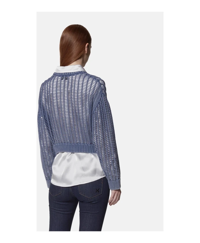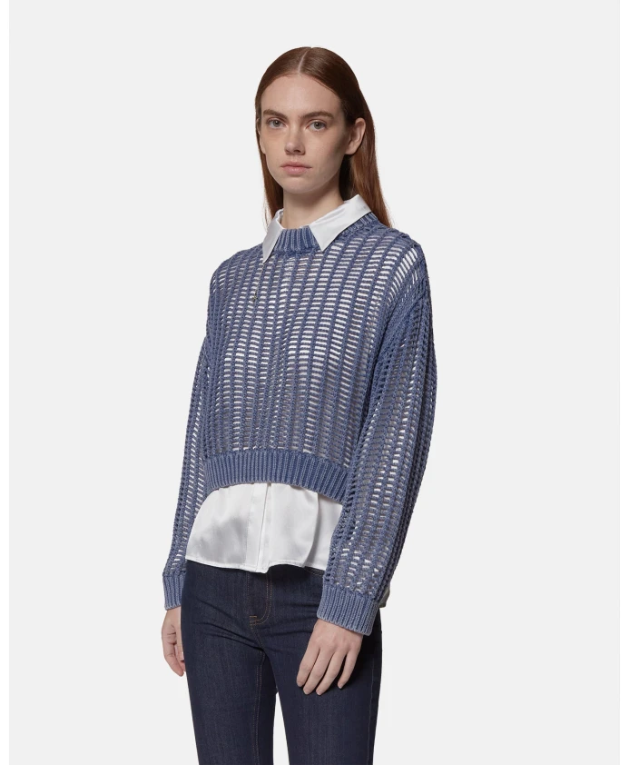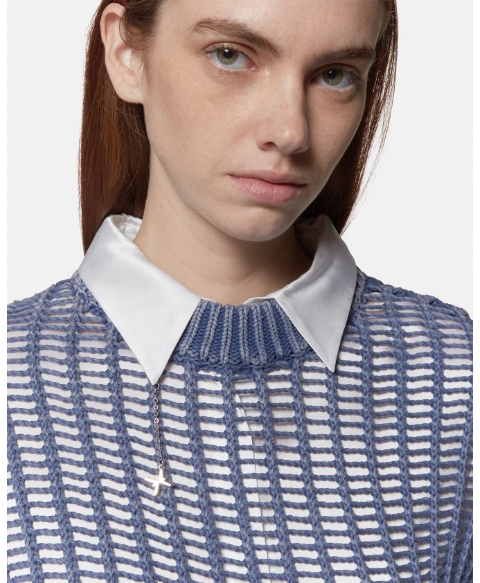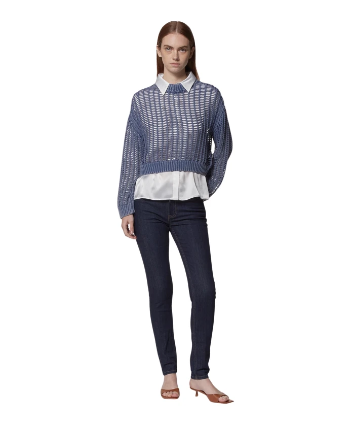 Этот синий перфорированный свитер - универсальная и современная вещь, дополненная белой вставкой, создающей непринужденно изысканный многослойный образ. Изготовленный из легкой и дышащей пряжи, он имеет широкую вязку, создающую динамичный визуальный эффект. Вставка с классическим воротником и подолом, выглядывающая из-под свитера, добавляет элегантности повседневному дизайну. Идеально подходит для образов в стиле smart-casual, легко сочетается с джинсами или классическими брюками, создавая сбалансированный и модный образ. Ключевые характеристики: Материал: Легкая и дышащая пряжа; Хлопковая ткань для рубашек; Детали: Перфорированный дизайн, вставка, классический воротник. Крой: Свободный. Стиль: Smart casual, современный. Повод: Офис, неформальные прогулки, элегантные неформальные мероприятия. Артикул UWP25070MA. Состав: 100% хлопок