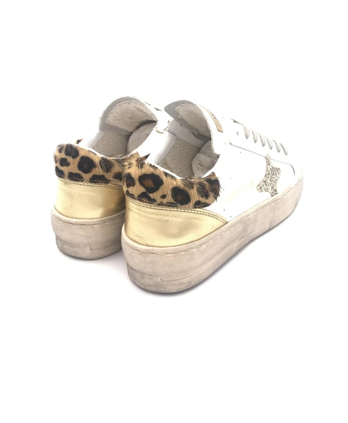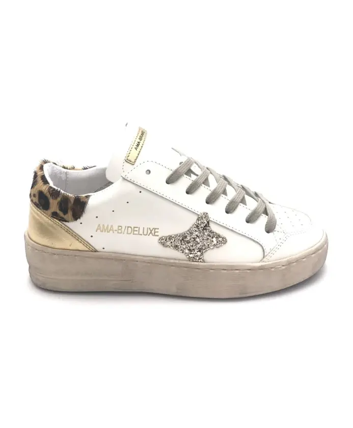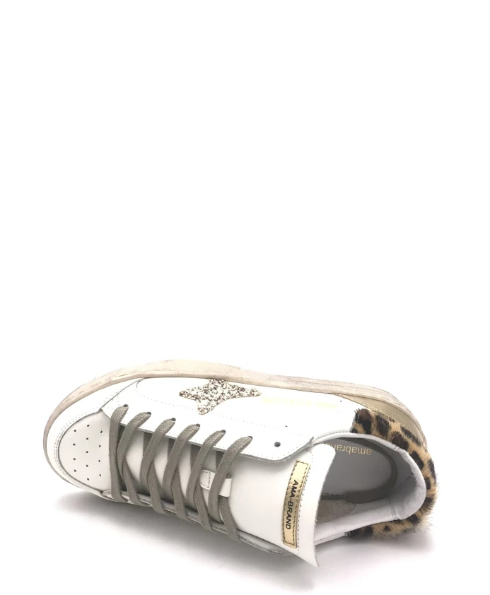 Кроссовки Ama Brand Slam сочетают в себе ретро-силуэт с золотистыми ламинированными кожаными накладками и анималистичным задником, создавая изысканный повседневный образ. Эффект потертости и логотип с блестками добавляют изюминку, а латексная кожаная стелька обеспечивает комфорт. Ключевые особенности: Белый | Bianca oro | Кожа | Шнуровка | Мягкая латексная и кожаная стелька | Ретро-силуэт | Прошитый и перфорированный носок | Золотистые ламинированные кожаные накладки | Анималистичный меховой задник | Золотистый блестящий логотип на боковой части верха | Белый кожаный язычок | Бежевые шнурки | Эффект потертости на верхней части | Состав и уход: Верх: Кожа | Накладки: Ламинированная кожа (золотистая) | Задник: Мех (Cavallino) | Деталь логотипа: Блестки | Подкладка: Кожа и хлопок | Стелька: Латекс и кожа | Подошва: Резина (бежевая)