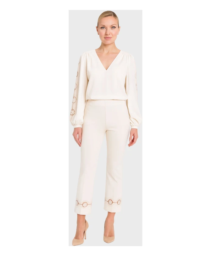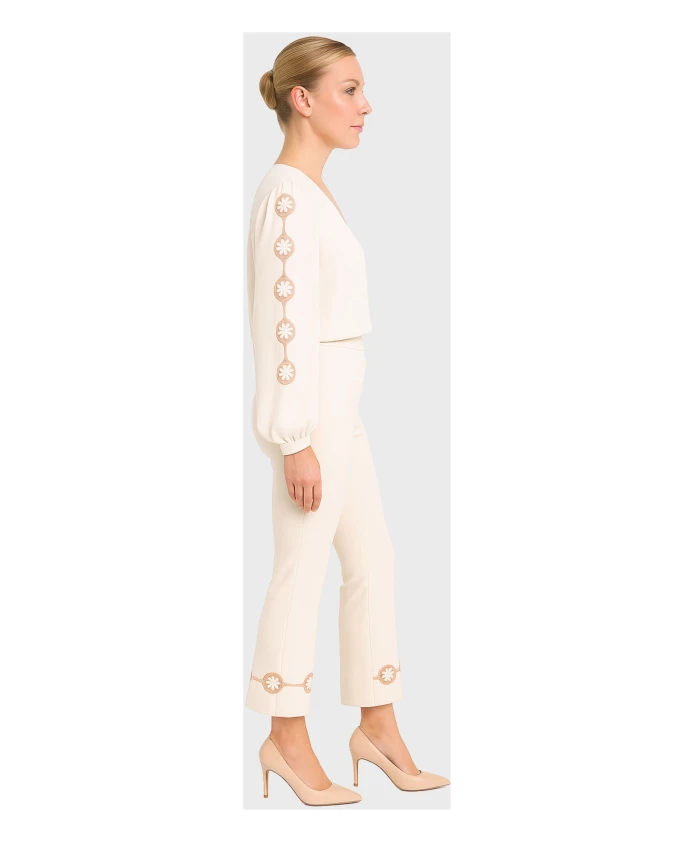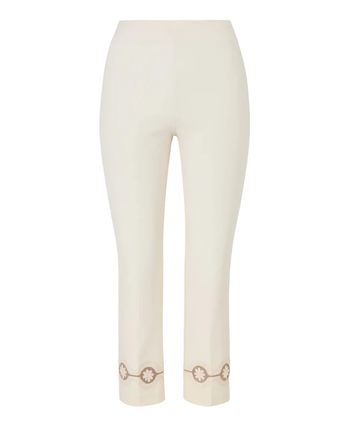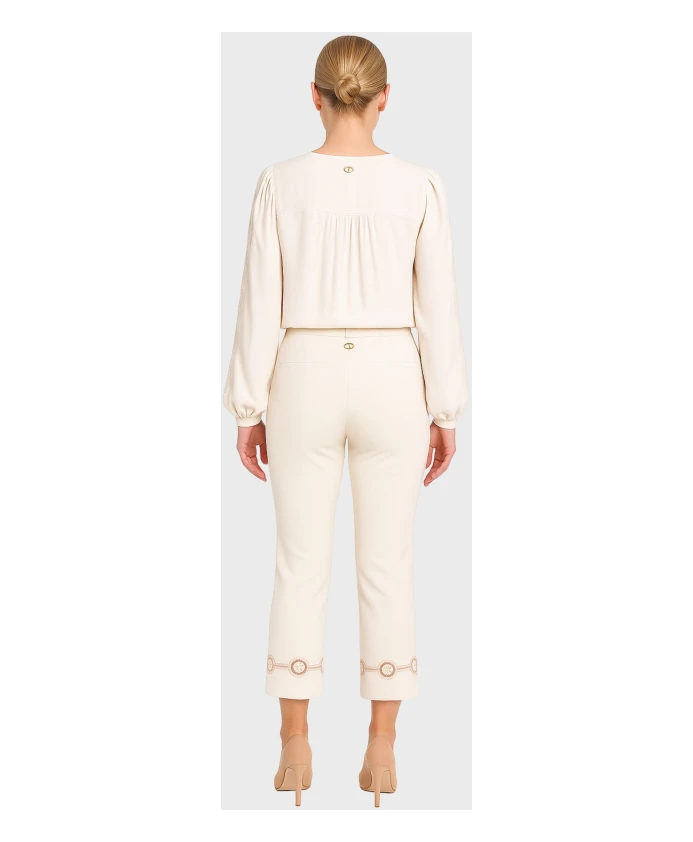 Укороченные брюки-сигареты от Twinset сочетают в себе узкий силуэт «сигареты» с изысканной цветочной вышивкой по низу, создавая элегантный современный образ, который идеально сочетается с туфлями на каблуках или сандалиями. Ключевые особенности: Бежевый | Слоновая кость | Вискоза | Потайная боковая застежка-молния | Складка спереди | Силуэт «сигареты» | Цветочная вышивка по низу | Длина до щиколотки | Складка спереди | Размеры и посадка: Обычный крой с силуэтом «сигареты» | Длина до щиколотки | Рост модели 178 см, размер S/40 | Состав и уход: 68% вискоза, 27% полиамид, 5% эластан | Подкладка: 100% полиэстер | Ткань 2: 100% полиэстер | Ткань 3: 100% полиамид | Не стирать. Не отбеливать. Не сушить в сушильной машине. Гладить при максимальной температуре 110°C. Бережная химчистка с использованием перхлорэтилена.