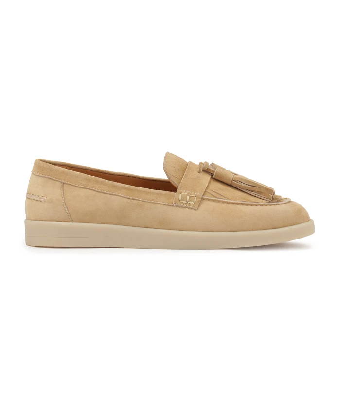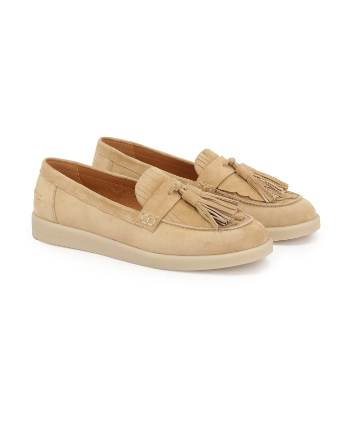 Эти лоферы, изготовленные из высококачественной замши, идеально сочетают в себе стиль и комфорт. Верхняя часть без шнурков обеспечивает комфорт и удобство надевания и снимания, а украшение в виде двух крючков и изящных кисточек придает обуви легкий и элегантный богемный шик. Плоская подошва гарантирует комфорт, делая их идеальным выбором для повседневной носки. Эти лоферы хорошо сочетаются как с повседневной одеждой, например, с джинсами, свободной рубашкой или легким платьем, так и с более элегантными комбинациями, например, с чиносами и классическим свитером. Их сдержанный цвет делает их универсальным аксессуаром, который добавит очарования любому образу. Мягкая подкладка из овчины гарантирует высокий уровень комфорта, а тонкая подкладка из искусственного меха обеспечивает ощущение тепла в холодные дни.