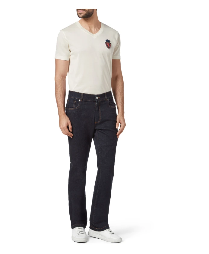 Джинсы Billionaire Regular Fit Palms - это обновленная версия классических джинсов с пятью карманами, выполненная в стиле «стоунвош» и украшенная мотивом кокосовой пальмы, характерным для этого сезона. Красочная вышивка и фирменная фурнитура добавляют этим джинсам стандартного кроя индивидуальности и практичности. Ключевые особенности: Темно-синий | Хлопок | Легкая эластичность | 5 карманов | Застежка на металлические пуговицы | Шлевки для ремня | Стиль «стоунвош» | Вышитая пальма и монограмма на правом заднем кармане | Задняя этикетка из искусственной кожи с ламинированным принтом | Швы табачного цвета | Герб Maison на фурнитуре | Размеры и посадка: Ширина штанины внизу: 22 см | Стандартный крой | Состав и уход: Ткань 1: 98% хлопок, 2% эластан | Подкладка 1: 65% полиэстер, 35% хлопок