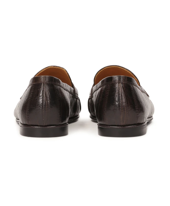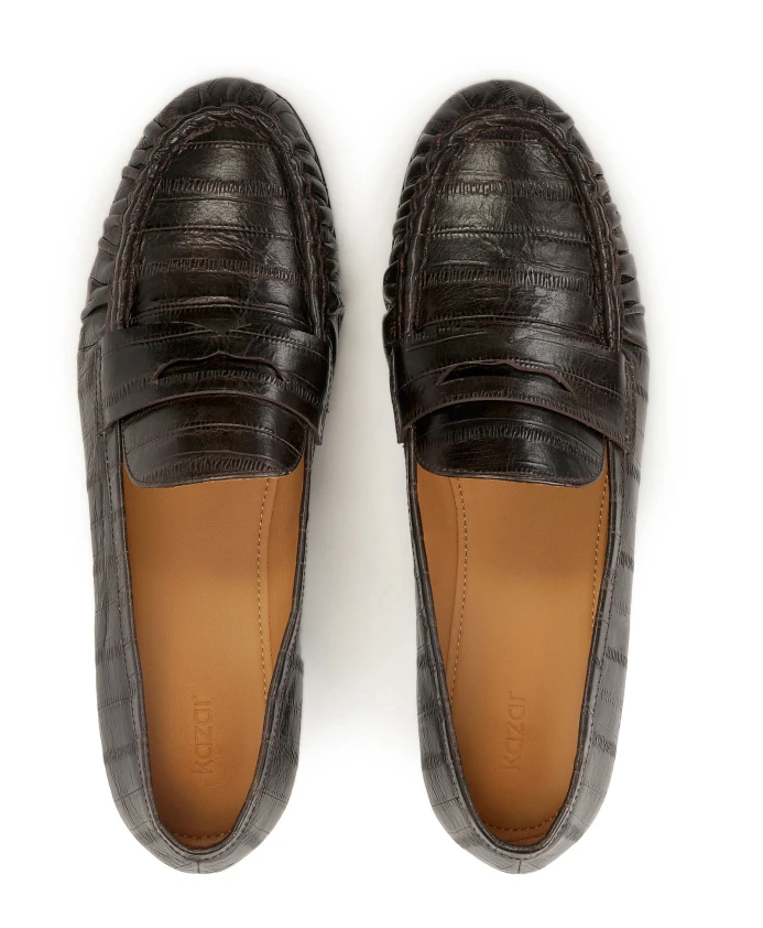 Сочетание классической элегантности и эффектных деталей. Эти коричневые туфли без шнурков изготовлены из натуральной кожи с изысканным тиснением под крокодила, которое подчеркивает глубину цвета и текстуру материала. Легкий блеск кожи придает обуви нотку роскоши, сохраняя при этом сдержанную элегантность и вневременной стиль. Плоская подошва в сочетании с закругленным носком и приподнятым, гофрированным швом вдоль линии создает цельную, сбалансированную форму, вдохновленную классическим дизайном с современным акцентом. Конструкция без шнурков обеспечивает комфорт при ношении и универсальность в создании образов. Эти туфли идеально дополнят повседневные осенние и весенние наряды. Мягкая подкладка из полуанилиновой овчины гарантирует исключительный комфорт.