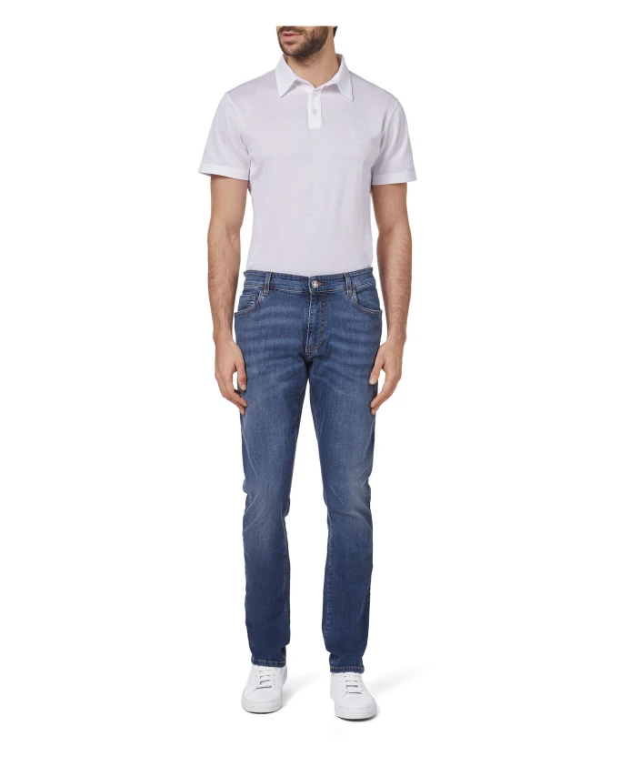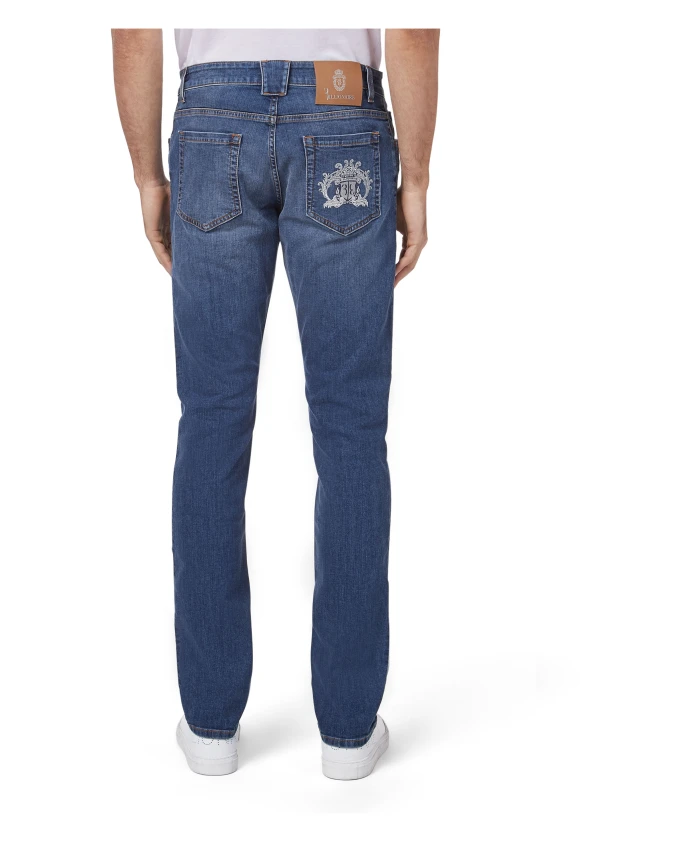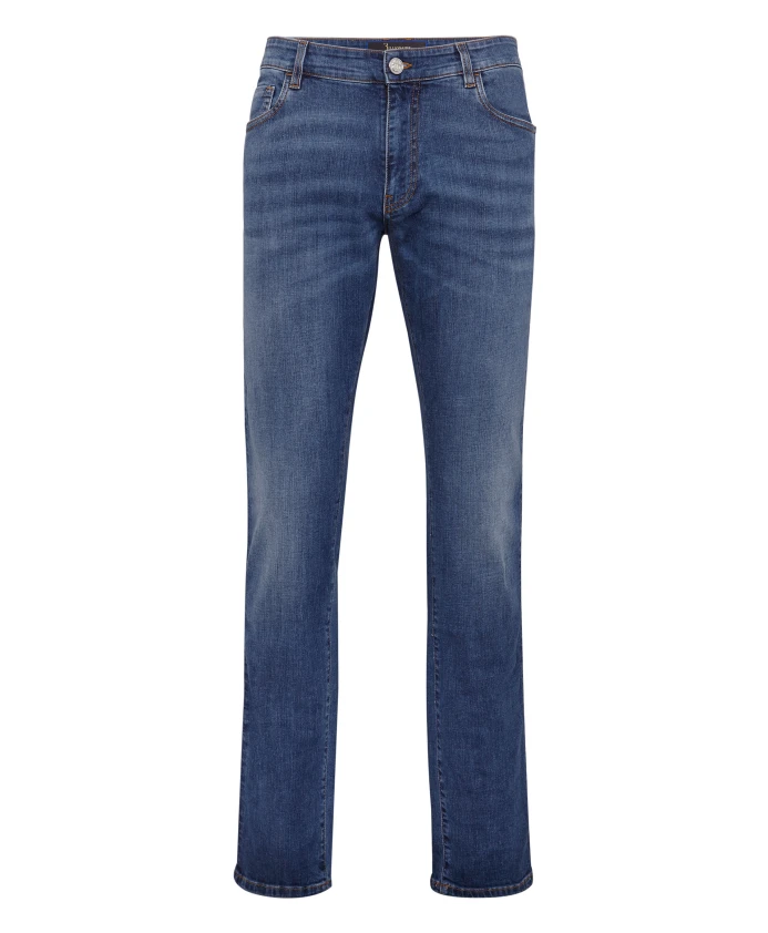 Джинсы Billionaire Straight Cut BAROQUE сочетают в себе лаконичный, идеально прямой силуэт с фирменной вышитой эмблемой бренда на заднем кармане, создавая стильный и непринужденный вариант джинсов для гардероба в стиле smart-casual. Ключевые особенности: Синий | Средне-синий | Хлопок | Слегка эластичный | Застежка-молния с одной металлической пуговицей | Заклепки с эмблемой | Классическая пятикарманная компоновка | Вышитая эмблема на правом заднем кармане | Швы табачного цвета | Кожаная этикетка с ламинированным принтом на поясе сзади | Эффект потертости | Пятикарманный стиль | Размеры и посадка: Ширина низа: 18 см | Идеально прямой крой | Состав и уход: Ткань: 99% хлопок, 1% эластан | Подкладка: 65% полиэстер, 35% хлопок