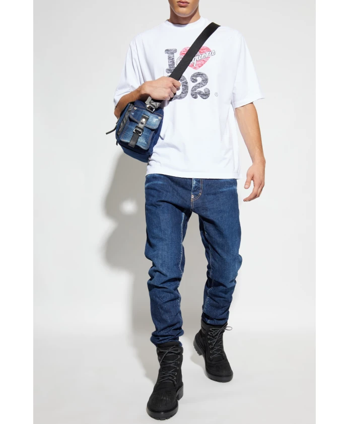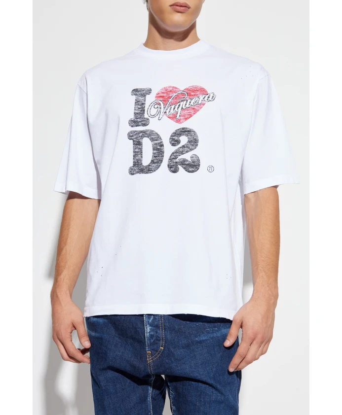 Dsquared2 представляет футболку X Vaquera, созданную в сотрудничестве с Vaquera, которая отличается ярким графическим принтом "I ¤ Vaquera D2" на передней части и намеренно состаренной отделкой для авангардного повседневного образа. Ключевые особенности: Белый | Хлопок | Мягкая на ощупь | Гладкая, ровная текстура | Графический принт "I ¤ Vaquera D2" на передней части | Деталь в виде красного сердца с декоративной курсивной надписью | Намеренно состаренная отделка | Нежная цветовая гамма для художественного эффекта | Размеры и посадка: Параметры модели - Рост: 185 см; Обхват груди: 92 см; Обхват талии: 74 см; Обхват бедер: 91 см; Модель носит размер: L | Свободный, слегка оверсайз крой | Состав и уход: Хлопок