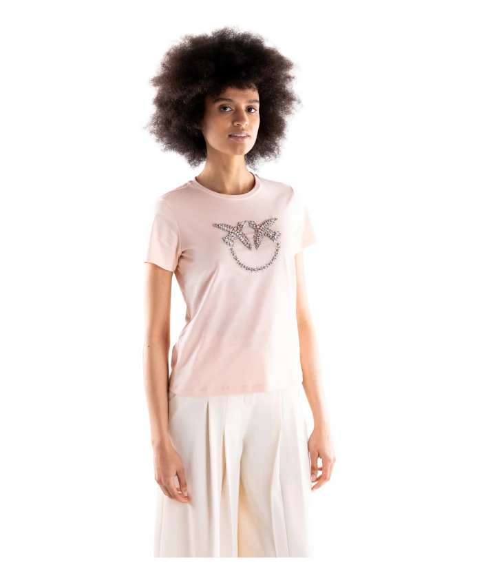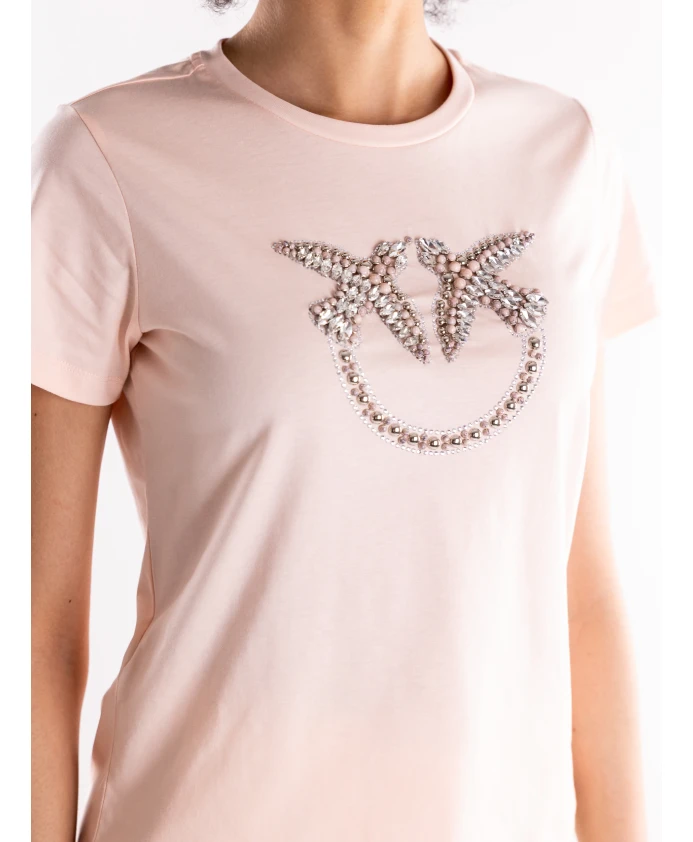 Футболка PINKO Quentin изготовлена из хлопкового трикотажа и украшена крупным вышитым логотипом Love Birds на передней части, а также бусинами и кристаллами. Она добавит декоративный, сверкающий штрих к повседневным образам. Ключевые особенности: Розовый | Хлопок | Круглый вырез | Короткие рукава | Трикотажная текстура | Крупная вышивка Love Birds на передней части | Украшена бусинами и кристаллами | Ребристый вырез | Размер и посадка: Стандартный крой | Состав ткани и уход: 100% хлопок | Ручная стирка; не отбеливать; не сушить в сушильной машине; гладить при температуре не выше 110°C; не подвергать химчистке; сушить в подвешенном состоянии; бережно обращаться с аппликациями и вышивкой при стирке и глажке.