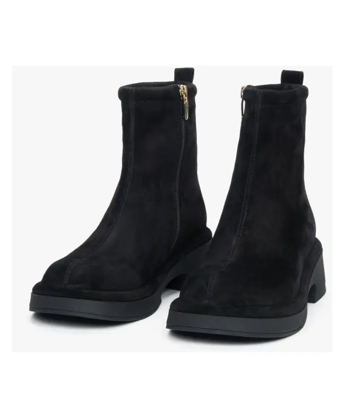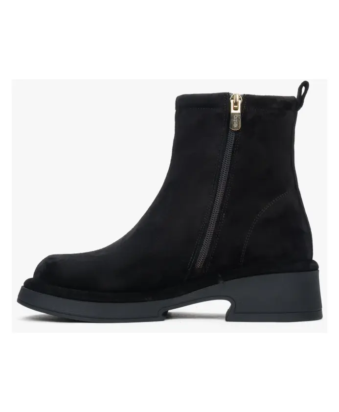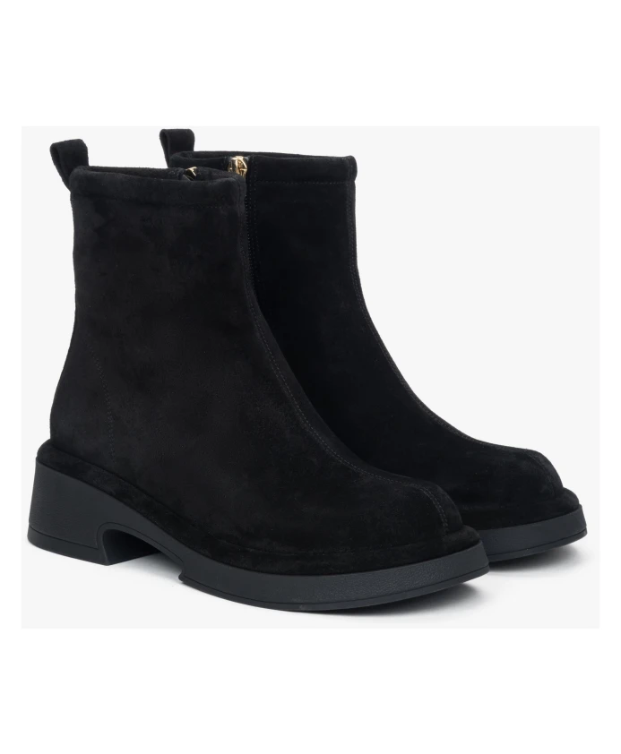 Ботильоны Estro сочетают в себе теплую фланелевую подкладку и прочный блочный каблук для комфортного ношения осенью и зимой. Дизайн сочетает мягкий замшевый верх с легкой, гибкой подошвой для повседневного использования. Ключевые особенности: Черный | Натуральная замша | Легкая подошва TR для гибкости и долговечности | Теплая фланелевая подкладка | Фланелевая стелька | Застежка-молния сбоку | Блочный каблук | Мягкий замшевый верх | Застежка-молния сбоку для удобства надевания и снимания | Размеры и посадка: 36 - 23 см | 37 - 23,5 см | 38 - 24,5 см | 39 - 25 см | 40 - 25,5 см. Маломерят - рекомендуем заказывать на один размер больше. | В остальном, стандартный размер. | Состав и уход: 100% натуральная замша