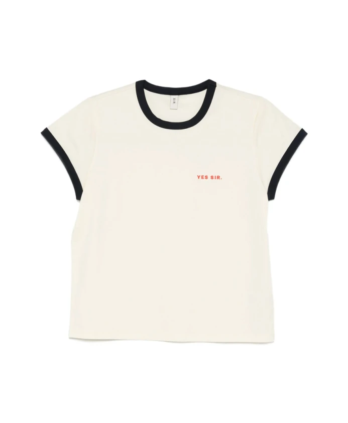 Футболка SIR. Yes Sir Fitted Tee от SIR. имеет приталенный крой, контрастную отделку и едва заметную надпись «YES SIR.» на передней части, создавая изысканный повседневный образ. Основные характеристики: Цвет: Слоновая кость | Хлопок | Слегка эластичная ткань | Круглый вырез | Короткие рукава | Контрастная отделка на воротнике и рукавах | Логотип «YES SIR.» на передней части | Размеры и посадка: Приталенный крой | Соответствует размеру | Состав ткани и уход: 86% хлопок, 14% эластан | Бережная машинная стирка в холодной воде с вещами схожих цветов; стирать наизнанку; избегать контакта со светлыми тканями; не отбеливать; не сушить в сушильной машине; сушить на воздухе; гладить теплым утюгом с изнанки.