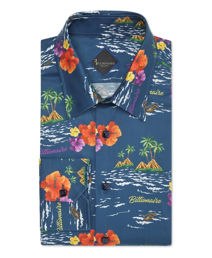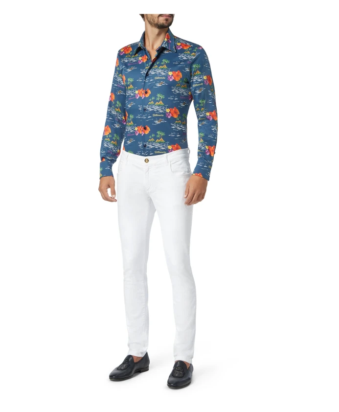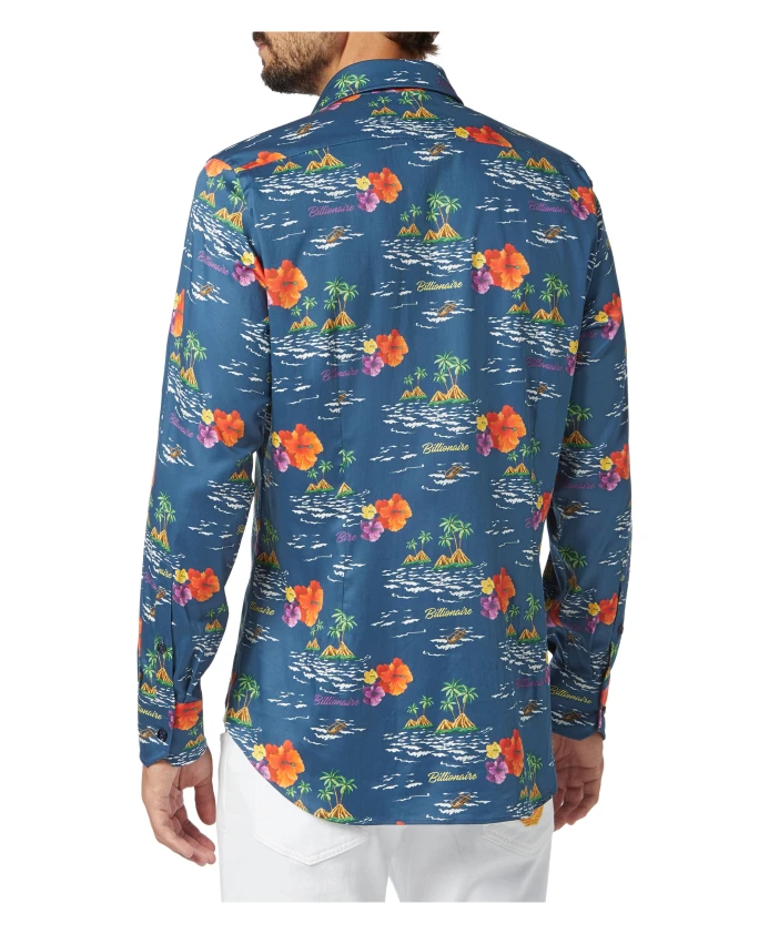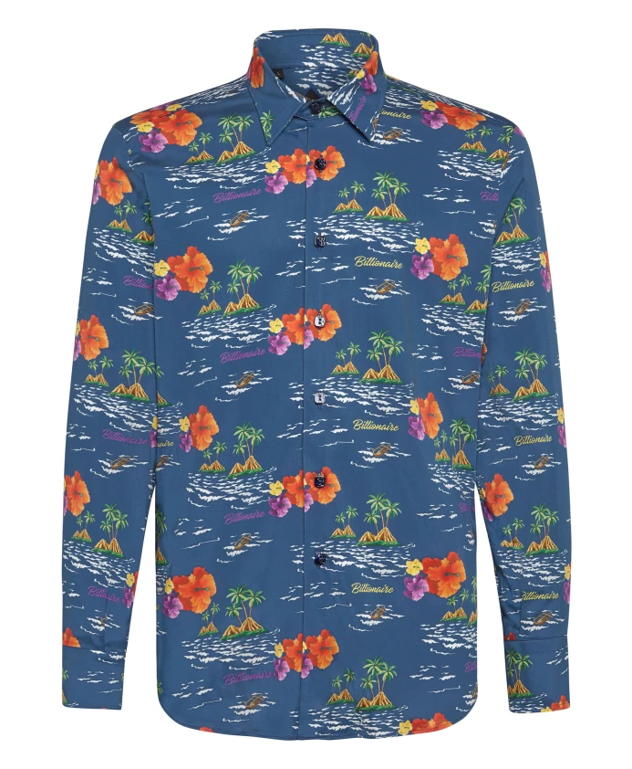 Рубашка Billionaire Slim Fit Palms Milano из хлопкового поплина с принтом в виде пальм и тропических цветов отлично сочетается как с пиджаком, так и с джинсами. Она имеет воротник-стойку Milano с рисунком листьев и квадратные перламутровые пуговицы, создавая изысканный и практичный образ. Основные характеристики: Многоцветная | Темно-синяя | Хлопковый поплин | Эластичная ткань | Застежка на пуговицы (перламутровые пуговицы) | Две складки на спине | Принт в виде пальм и тропических цветов | Небольшой воротник-стойка с рисунком листьев (Milano) | Квадратные перламутровые пуговицы | Две складки на спине | Размеры и посадка: Приталенный крой (серебристый) | Состав и уход: 97% хлопок, 3% эластан