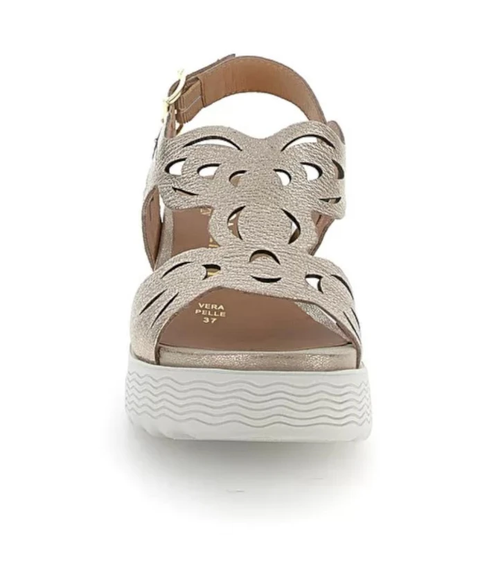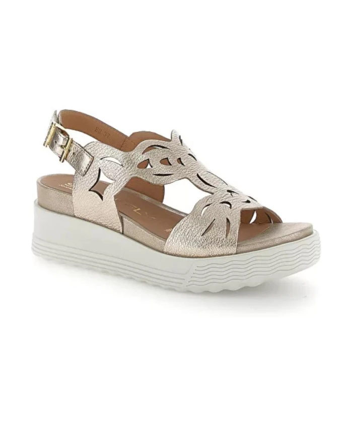 Сандалии на танкетке STONEFLY A07899 сочетают в себе верх из кожи с лазерной гравировкой и технологию Second Skin, создавая легкие и элегантные летние сандалии на танкетке. Регулируемая пряжка и мягкая подошва из ЭВА обеспечивают комфорт в течение всего дня в сочетании с теплой летней одеждой. Ключевые особенности: Золотистый цвет | Кожа с покрытием | Технология Second Skin для мягкости и легкости | Легкая конструкция | Регулируемая застежка-пряжка | Подошва из ЭВА для амортизации | Верх с геометрическим рисунком, выполненным лазерной гравировкой | Танкетка | Открытый носок | Размеры и посадка: Высота каблука: 6 см | Высота платформы: 3 см | Состав и уход: Кожа с покрытием | Подошва из ЭВА