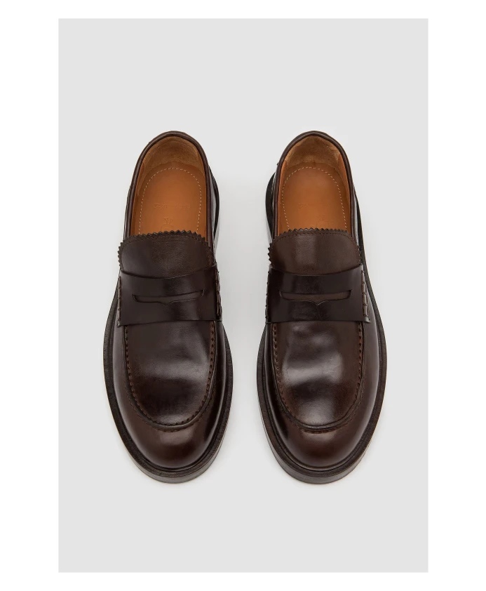 Лоферы Elia Maurizi Penny - это классические слипоны из буйволиной кожи растительного дубления, идеально подходящие для элегантного повседневного образа. Тройная кожаная подошва с полурезиновой вставкой сочетает в себе традиционную конструкцию и улучшенное сцепление. Ключевые особенности: Темно-коричневый | Буйволиная кожа | Противоскользящая подошва | Тройная кожаная подошва | Полурезиновая вставка для улучшенного сцепления | Подкладка из кожи наппа растительного дубления | Ремешок-пенни | Силуэт слипоны | Размер и посадка: Стандартная посадка | Состав и уход: 100% буйволиная кожа растительного дубления (верх) | Подкладка: Кожа наппа растительного дубления | Подошва: Кожа и резина
