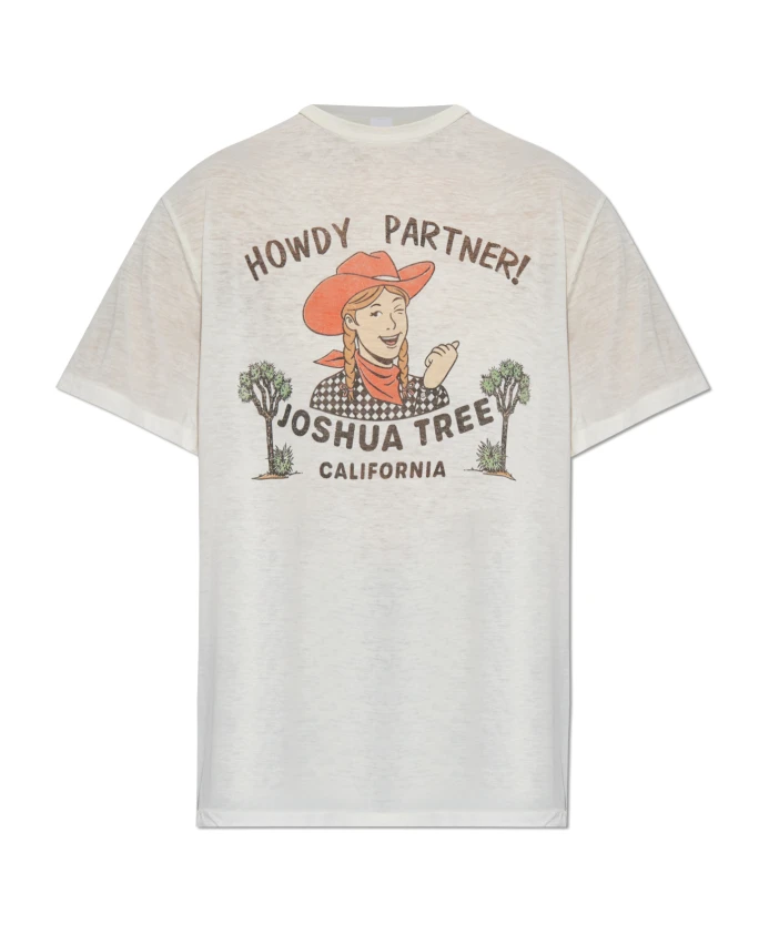 Футболка Re/Done с принтом сочетает в себе винтажный рисунок пустыни и слегка свободный силуэт для повседневной носки. Ключевые особенности: Бежевый | Кремовый | Хлопок | Дышащий | Легкий | Слегка полупрозрачная текстура | Легко сочетается с другой одеждой | Повседневная одежда | Круглый вырез | Короткие рукава | Ретро-принт с изображением девушки в ковбойской шляпе и деревьев Джошуа | Надписи в винтажном стиле: "HOWDY PARTNER!" и "JOSHUA TREE" | Размеры и посадка: Рост модели: 176 см | Обхват груди: 85 см | Обхват талии: 60 см | Обхват бедер: 89 см | Модель носит размер: S | Слегка свободный крой | Создана для повседневной носки | Состав и уход: Хлопок | Полиэстер