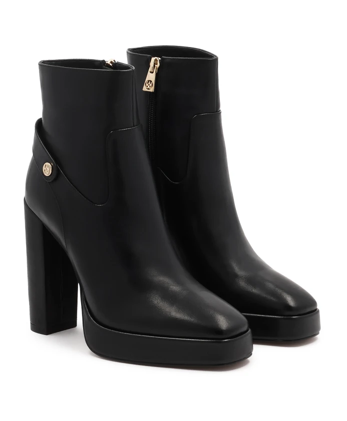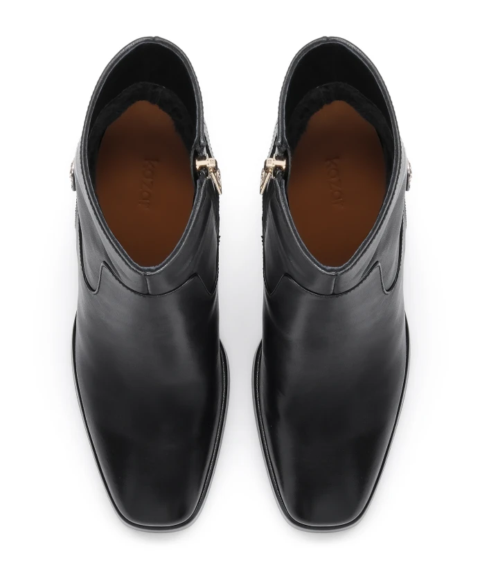 Эти черные сапоги, изготовленные из высококачественной натуральной кожи, впечатляют своей гладкой текстурой и классическим дизайном, что делает их идеальным дополнением как к повседневной, так и к более изысканной одежде. Высокий каблук визуально удлиняет ноги, обеспечивая при этом устойчивость и комфорт. Интегрированная платформа уравновешивает высоту каблука, гарантируя комфорт даже при длительном ношении. Застежка-молния сверху обеспечивает идеальную посадку, а едва заметная монограмма KAZAR сбоку добавляет нотку роскоши. Мягкая подкладка из полуанилиновой овчины гарантирует исключительный комфорт, а подкладка из искусственного меха согреет в холодные дни.