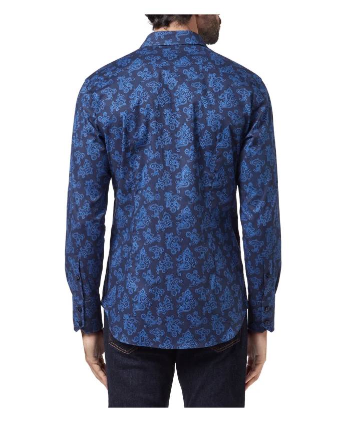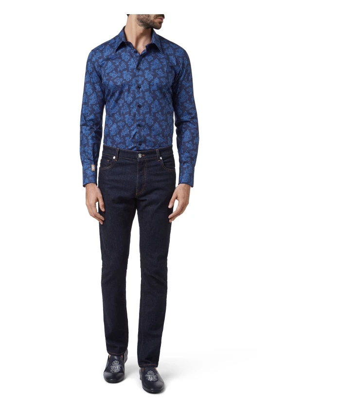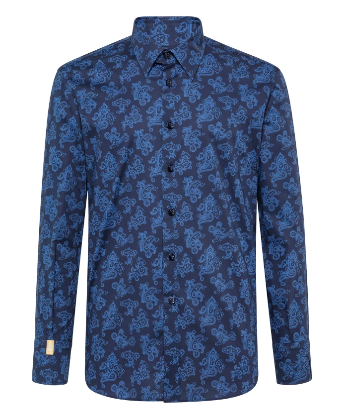 Рубашка Billionaire Milano сочетает в себе узор «пейсли» по всей поверхности (Boteh) с классическими деталями кроя, что делает ее универсальной, элегантной или в стиле smart casual. Изготовлена из хлопкового поплина, имеет небольшой воротник-стойку и квадратные перламутровые пуговицы для изысканных акцентов. Ключевые особенности: Синий | Темно-синий | Хлопковый поплин | Эластичная ткань | Манжеты на двух пуговицах (левая манжета для часов) | Квадратные перламутровые пуговицы | Узор «пейсли» по всей поверхности (Boteh) | Небольшой воротник-стойка (стиль Milano) | Размеры и посадка: Обычная/Золотистая посадка | Состав и уход: 97% хлопок | 3% эластан