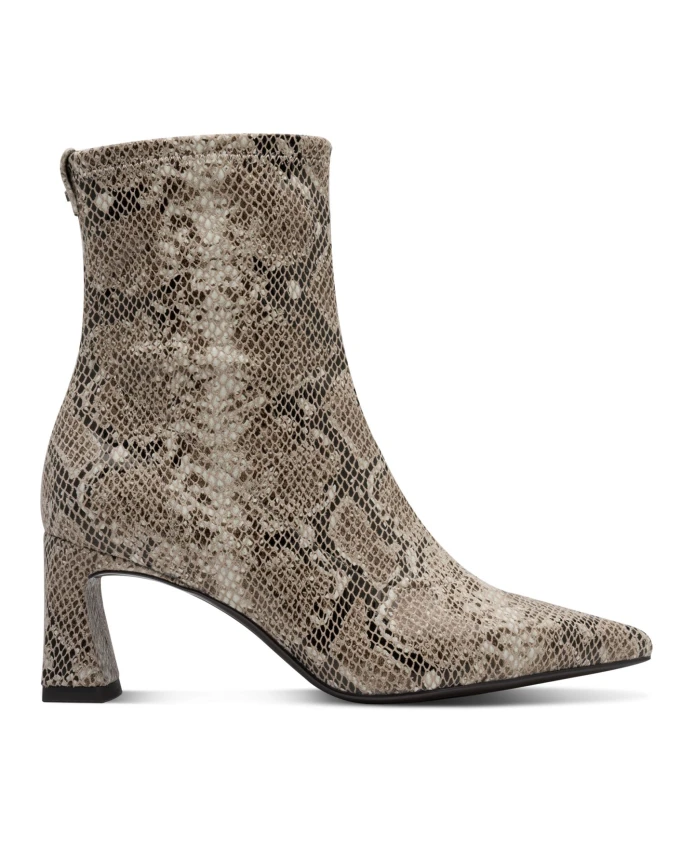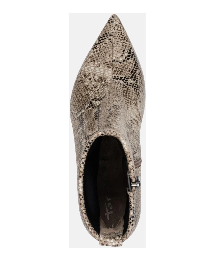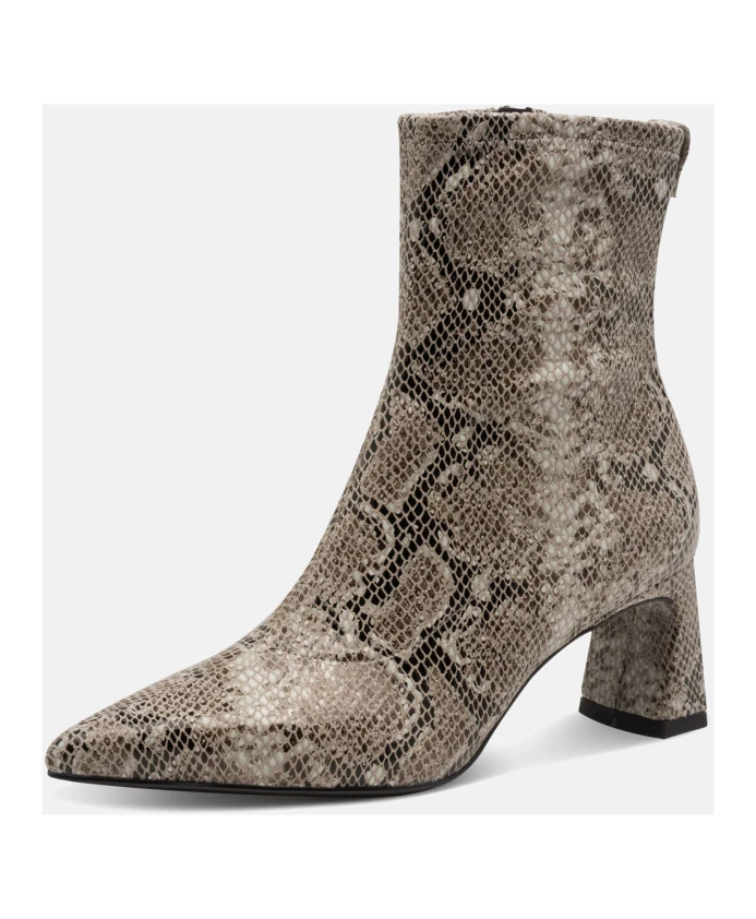 Ботильоны Tamaris с заостренным носком и каблуком-бананом сочетают в себе современный городской стиль и комфортные технологии. Идеально подходят для работы, вечеринки или особых случаев, где важны стиль и устойчивость. Ключевые особенности: Коричневый | Питоне | Ткань | Противоскользящая технология | Амортизирующая технология | Адаптивная стелька Touch-IT | Застежка-молния | Тканевая стелька | Синтетическая подошва | Заостренный носок | Каблук-банан | Текстильный верх с принтом «змеиная кожа» (питоне) | Высота голенища: 15,5 см | Высота каблука: 65 мм | Состав и уход: Верх: Ткань | Подкладка: Ткань, Синтетика | Стелька: Ткань | Подошва: Синтетика