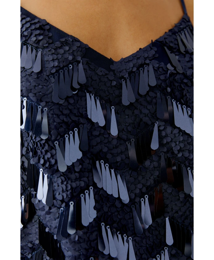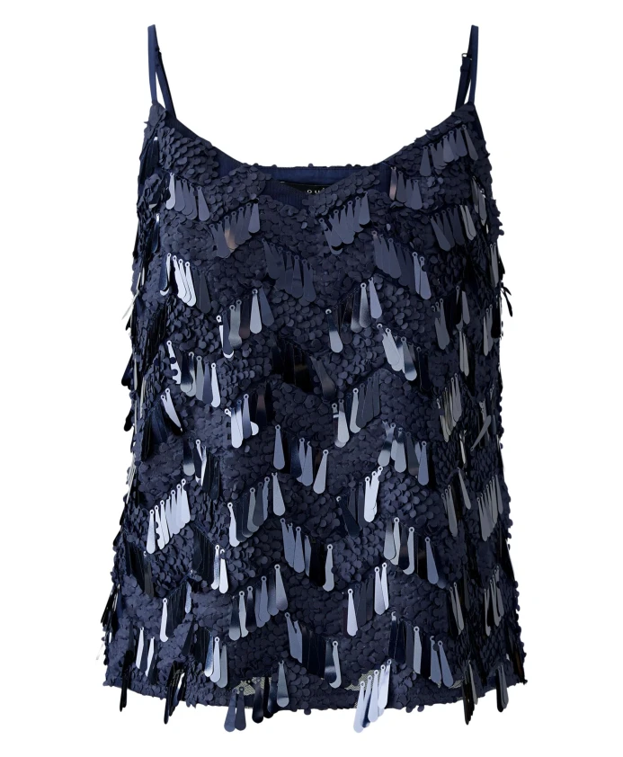 Топ Oui Sequin Cami Top сочетает в себе нежную сетку с чередующимися матовыми, круглыми и блестящими, удлиненными пайетками, что делает его эффектным вечерним нарядом. Укороченный прямой крой и регулируемые атласные бретельки позволяют легко сочетать его с элегантными брюками или юбками. Ключевые особенности: Синий | Темно-синий | Сетка | Регулируемые атласные бретельки | Полностью эластичная подкладка | Скрывает бюстгальтер | V-образный вырез спереди, прямая спинка | Без рукавов | Укороченный прямой крой | Декоративные матовые, круглые и блестящие, удлиненные пайетки | Размеры и посадка: Длина (размер 36): 60 см | Прямой крой | Укороченная длина