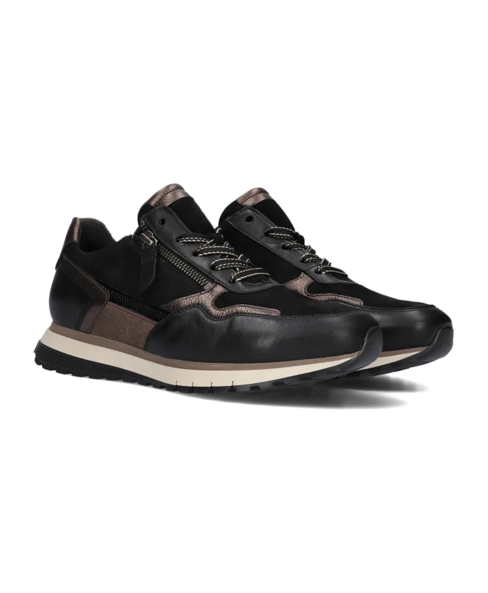 Эти черные низкие кроссовки модели 378 от GABOR выглядят стильно и идеально подходят для женщин, ценящих комфорт и моду. Модель имеет черный замшевый верх с вставками из гладкой, глянцевой и бронзовой кожи. Кроссовки легко застегиваются на молнию, избавляя от необходимости каждый раз завязывать шнурки. Резиновая подошва с коричневой акцентной полосой имеет цепкий протектор на черной зубчатой подошве. Эта модель идеально подходит для повседневной носки, например, для шопинга и прогулок. Сочетайте их с джинсами и повседневной блузкой для создания модного и непринужденного образа. Эти кроссовки - обязательный элемент гардероба каждой модницы!