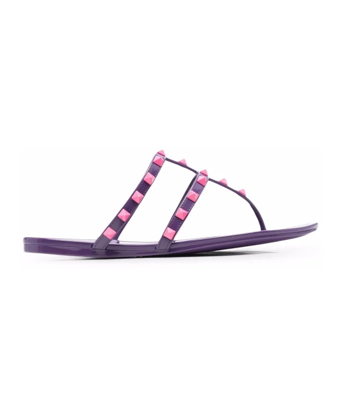 Сандалии Valentino Garavani Rockstud Slip-On сочетают в себе фирменные детали Rockstud и дизайн с облегающим верхом из ПВХ. Идеально подходят для повседневных летних образов, они легко надеваются и снимаются благодаря плоской подошве. Ключевые особенности: Фиолетовый | Розовый | ПВХ | Плоская резиновая подошва | Плоский каблук | Застежка без шнурков | Один ремешок на носке для надежной фиксации | Фирменные детали Rockstud | Облегающий Т-образный ремешок/перемычка | Один ремешок на носке | Стелька с логотипом | Размер и посадка: Американский размер обуви: 6 | Европейский размер обуви: 36 | Высота каблука: 0,5 см | Материал и уход: 100% ПВХ