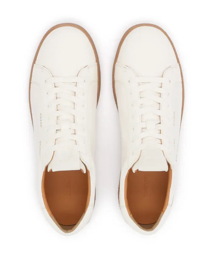 Минималистичные мужские кроссовки белого цвета, изготовленные из высококачественной натуральной кожи, - это вневременной выбор для любителей классического стиля с современным акцентом. Лаконичный силуэт, изящная строчка и золотой логотип KAZAR STUDIO придают им элегантный характер. Контрастная резиновая подошва карамельного цвета подчеркивает повседневный стиль обуви и обеспечивает комфорт и сцепление с поверхностью на каждый день. Идеально подходят для городского стиля - от джинсов до чиносов - для мужчин, которые ценят качество, комфорт и универсальный дизайн. Мягкая и эластичная подкладка из овчины обеспечивает исключительный комфорт.