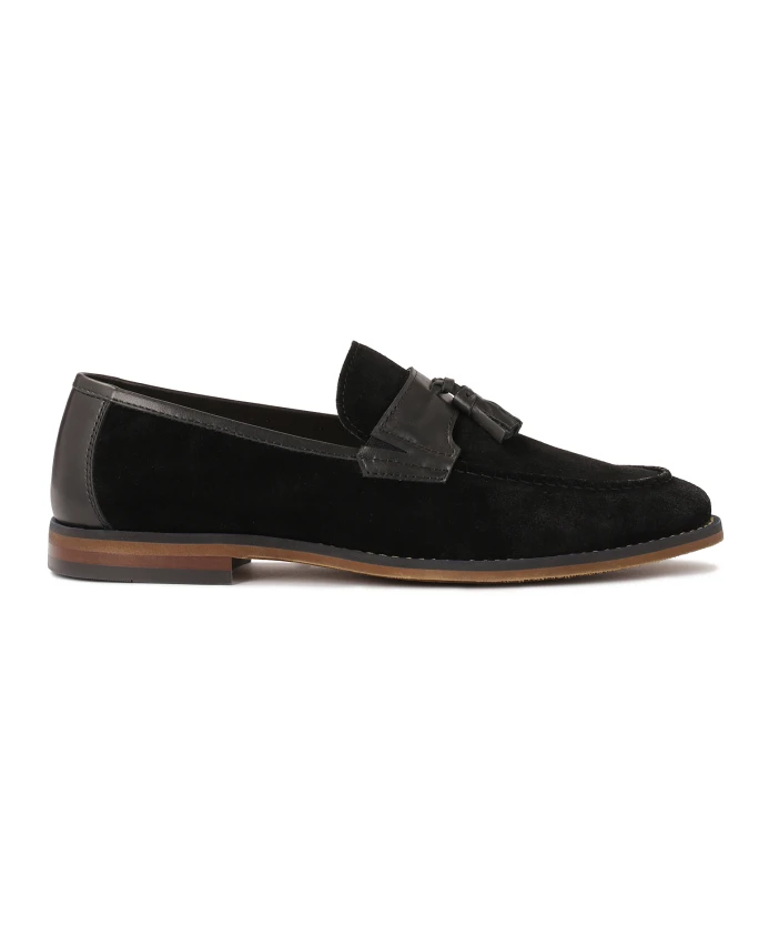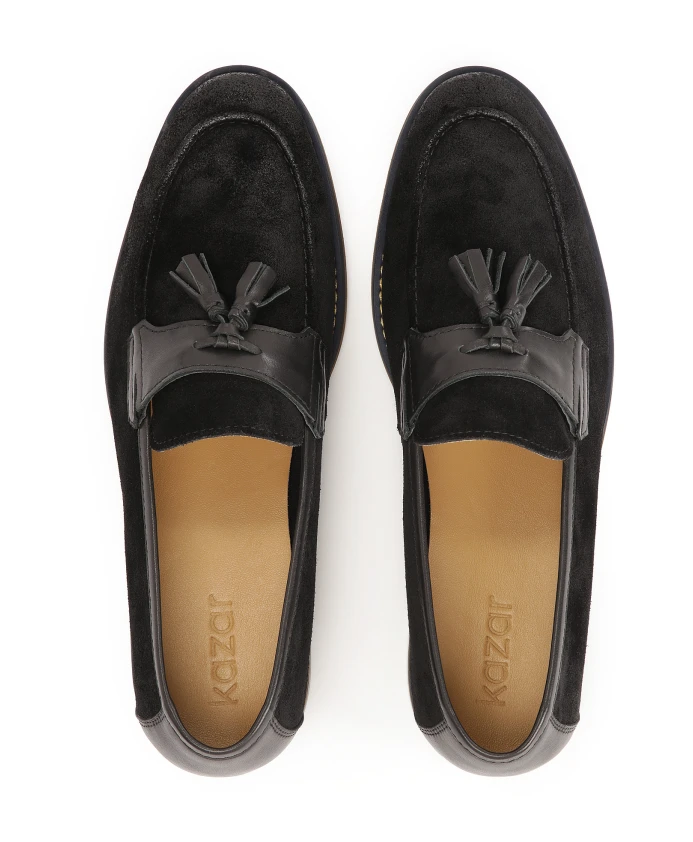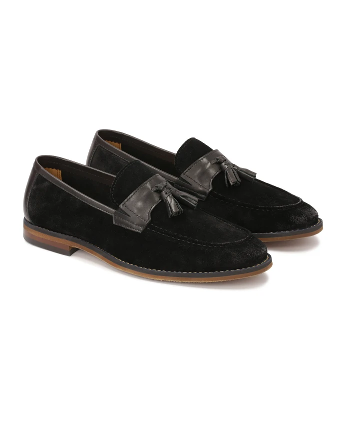Эти черные лоферы, изготовленные из комбинации замши и натуральной кожи, - элегантный выбор для мужчин, ценящих стиль и комфорт. Верхняя часть сочетает матовую замшу с гладкой кожей, создавая тонкий контраст текстур. Декоративный чокер спереди добавляет классический штрих и ощущение легкости. Трехцветная подошва - современный акцент, который отличает эти лоферы, придавая им динамичный и уникальный вид. Это позволяет модели сочетать элегантность и комфорт, делая ее подходящей как для формальных, так и для повседневных образов. Лоферы имеют мягкую подкладку из овчины, которая принимает форму стопы, гарантируя исключительный комфорт.