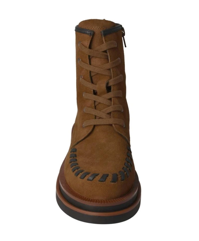 Ботинки Elvio Zanon на шнуровке из замши верблюжьего цвета с контрастным черным кожаным ремешком на мыске и двухцветной резиновой подошвой. Созданные для универсальной повседневной носки, они сочетают в себе шнуровку спереди и боковую молнию для удобства надевания и снимания, а также комфортной посадки. Ключевые особенности: Коричневый | Верблюжий | Замша | Шнуровка | Боковая молния | Петля сзади | Кожаная подкладка и стелька | Черный кожаный ремешок на мыске | Двухцветная резиновая подошва | Высота до щиколотки | Размеры и посадка: Высота каблука: 4,3 см | Высота платформы: 2,5 см | Свободный крой | Состав и уход: Замша | Кожа