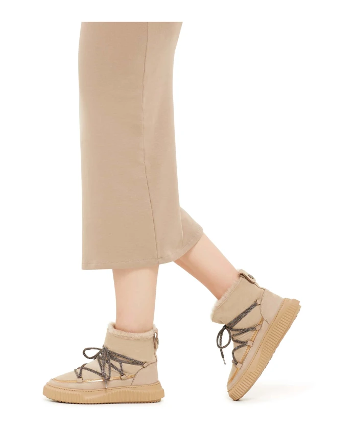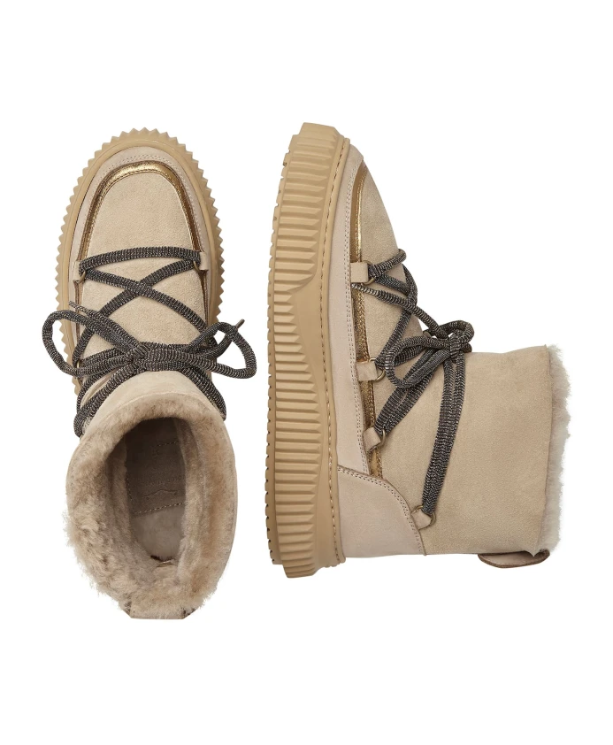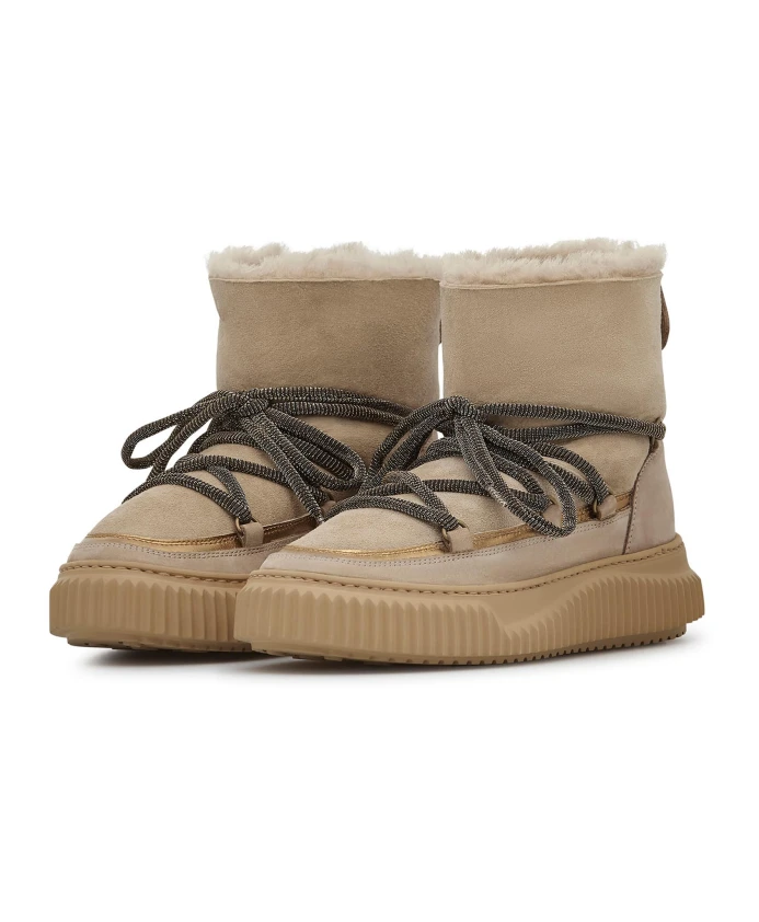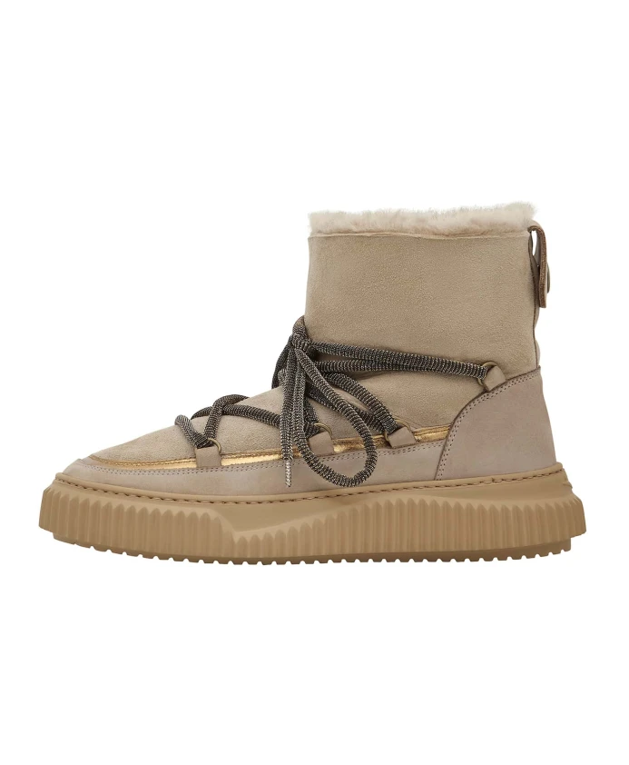 Замшевые ботильоны Voile Blanche CORTINA переосмысливают силуэт après-ski благодаря отделке из ламинированной кожи и шнуровке в стиле треккинга. Созданные для холодной погоды, они сочетают замшевый верх и шерстяную подкладку со сверхлегкой резиновой подошвой для легкости, тепла и сцепления. Ключевые особенности: Бежевый | Замша | Сверхлегкая резиновая подошва | Шнуровка | Шерстяная подкладка | Шерстяная стелька | Отделка из ламинированной кожи | Шнурки в стиле треккинга | Резиновая подошва с контурными краями | Силуэт в стиле après-ski | Состав и уход: Верх: Замша и кожа | Подкладка: Шерсть | Стелька: Шерсть | Подошва: Резина