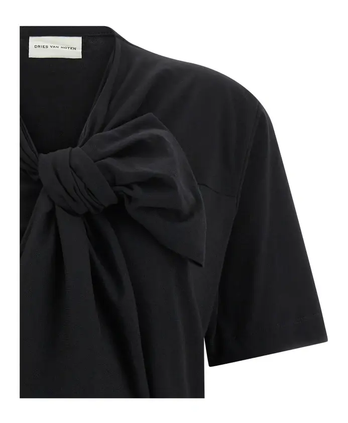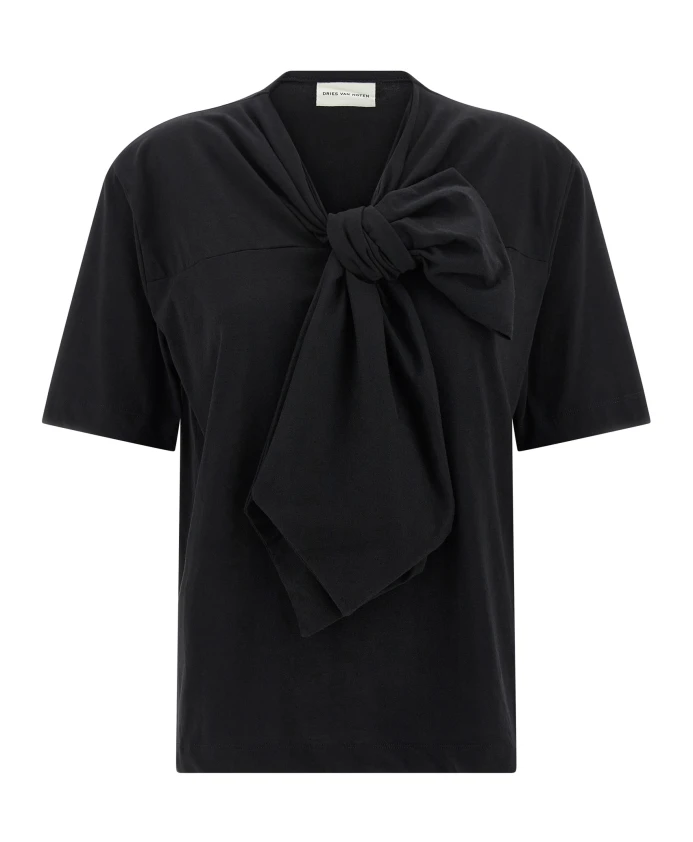 Футболка Hebitta от Dries Van Noten сочетает в себе воротник-стойку и короткие рукава, создавая стильную и универсальную модель, которая отлично подходит как для самостоятельного ношения, так и для многослойных образов. Основные характеристики: Черный | Хлопок | Средняя плотность | Дышащая ткань | Надевается без застежек | Воротник-стойка | Деталь в виде узла/банта спереди | V-образный вырез | Короткие рукава | Прямой низ | Размеры и посадка: Длина от плеча до низа: 66 см | Свободный крой | Соответствует размеру | Состав ткани и уход: 100% хлопок | Машинная стирка в холодной воде, деликатный режим. Сушка на воздухе.