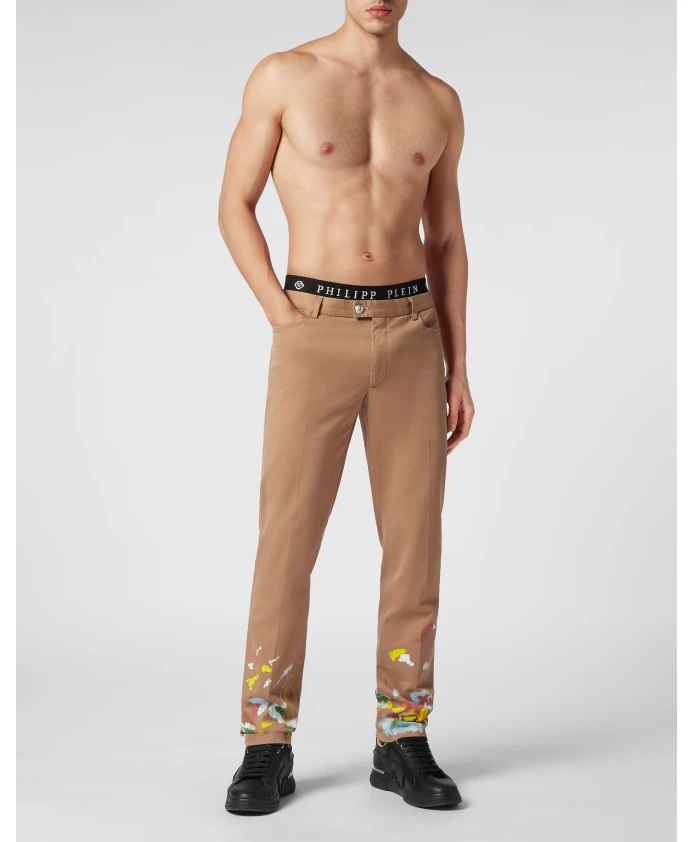 Брюки-чиносы Philipp Plein. Классические чиносы Dripping освежаются яркими цветовыми акцентами по низу. Эти брюки с пятью карманами, изготовленные из эластичного хлопкового габардина, сочетают в себе фирменный логотип и удобство повседневной носки. Ключевые особенности: Бежевый | Хлопок | Эластичный хлопковый габардин | Пять карманов | Застежка на одну металлическую пуговицу | Цветовые акценты по низу | Шестиугольник PP на кожаной нашивке из сафьяновой кожи на правом заднем кармане | Отделка габардином | Размеры и посадка: Чинос | Состав и уход: 97% хлопок, 3% эластан | Подкладка: 65% полиэстер, 35% хлопок