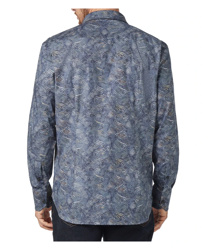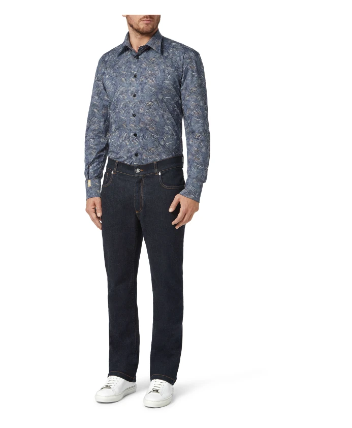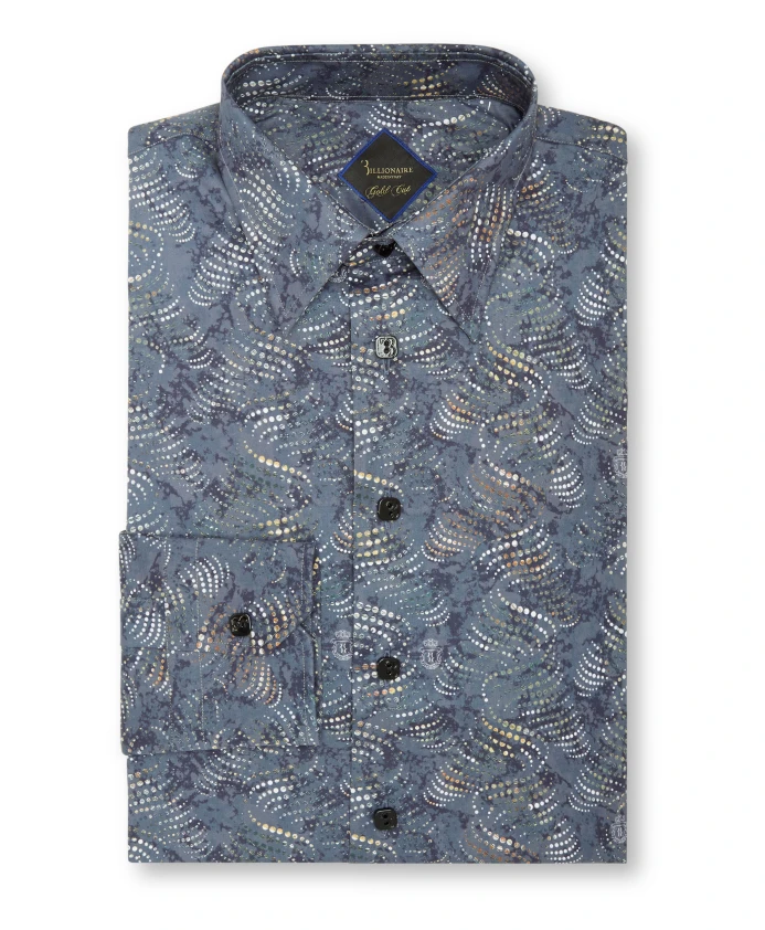 Рубашка Billionaire Milano сочетает в себе геометрический принт в стиле ар-деко и хлопковый поплин, создавая изысканный повседневный образ. Она имеет небольшой воротник-стойку Milano с рисунком в виде листьев и квадратные перламутровые пуговицы с логотипом, что придает ей элегантность. Ключевые особенности: Синий | Средне-синий | Хлопковый поплин | Застежка на пуговицы | Геометрический принт в стиле ар-деко по всей поверхности | Небольшой воротник-стойка Milano с рисунком в виде листьев | Квадратные перламутровые пуговицы с логотипом | Размеры и посадка: Обычный/Золотистый | Состав и уход: Хлопковый поплин